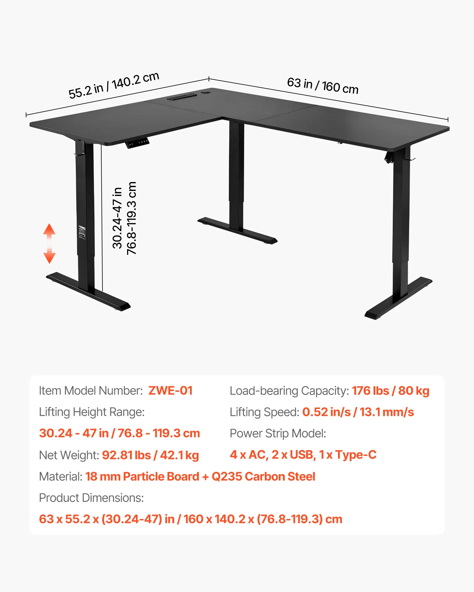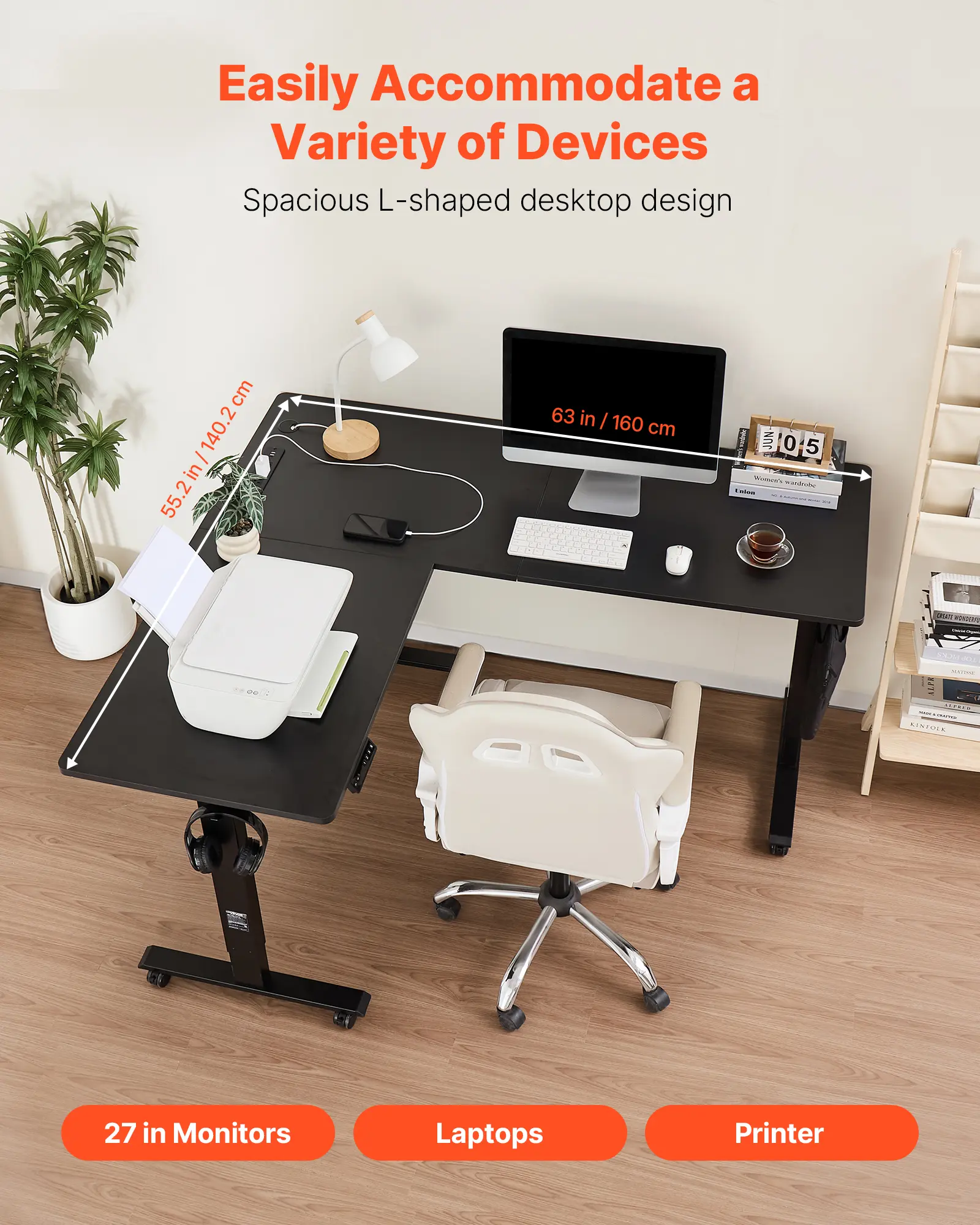 Spacious Workspace: The 63 x 55.2 in / 160 x 140.2 cm L-shaped adjustable height desk provides ample space, making it ideal for home offices and gaming. The large surface easily accommodates 3 monitors, 2 laptops, and other office accessories