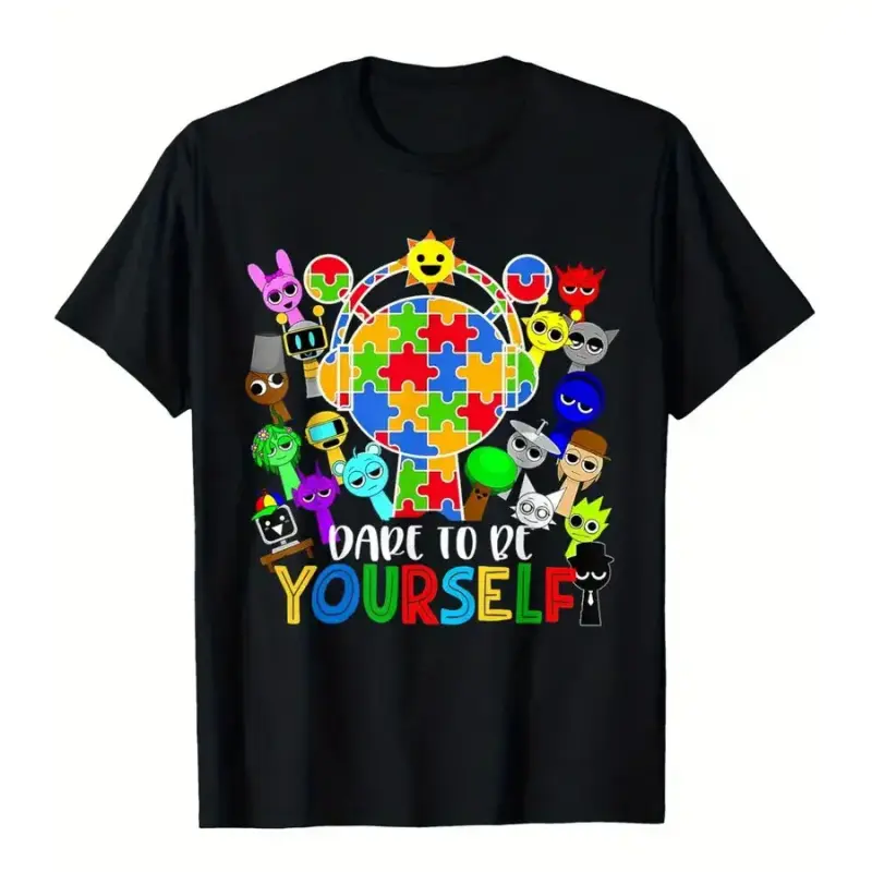 Sprunki Youngsters' Colorful Cartoon Character Cotton T-Shirt - Breathable, Quick-Drying, Short Sleeve Crew Neck,Kids' T-shirt,Children's Day Gift