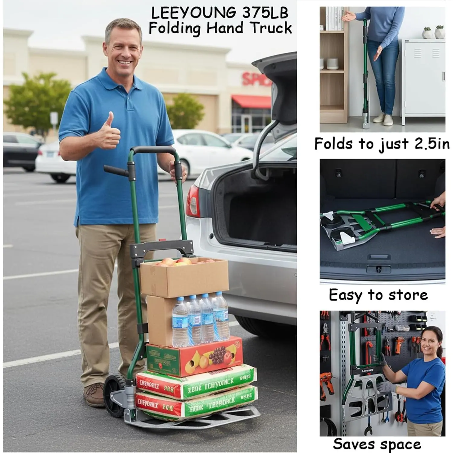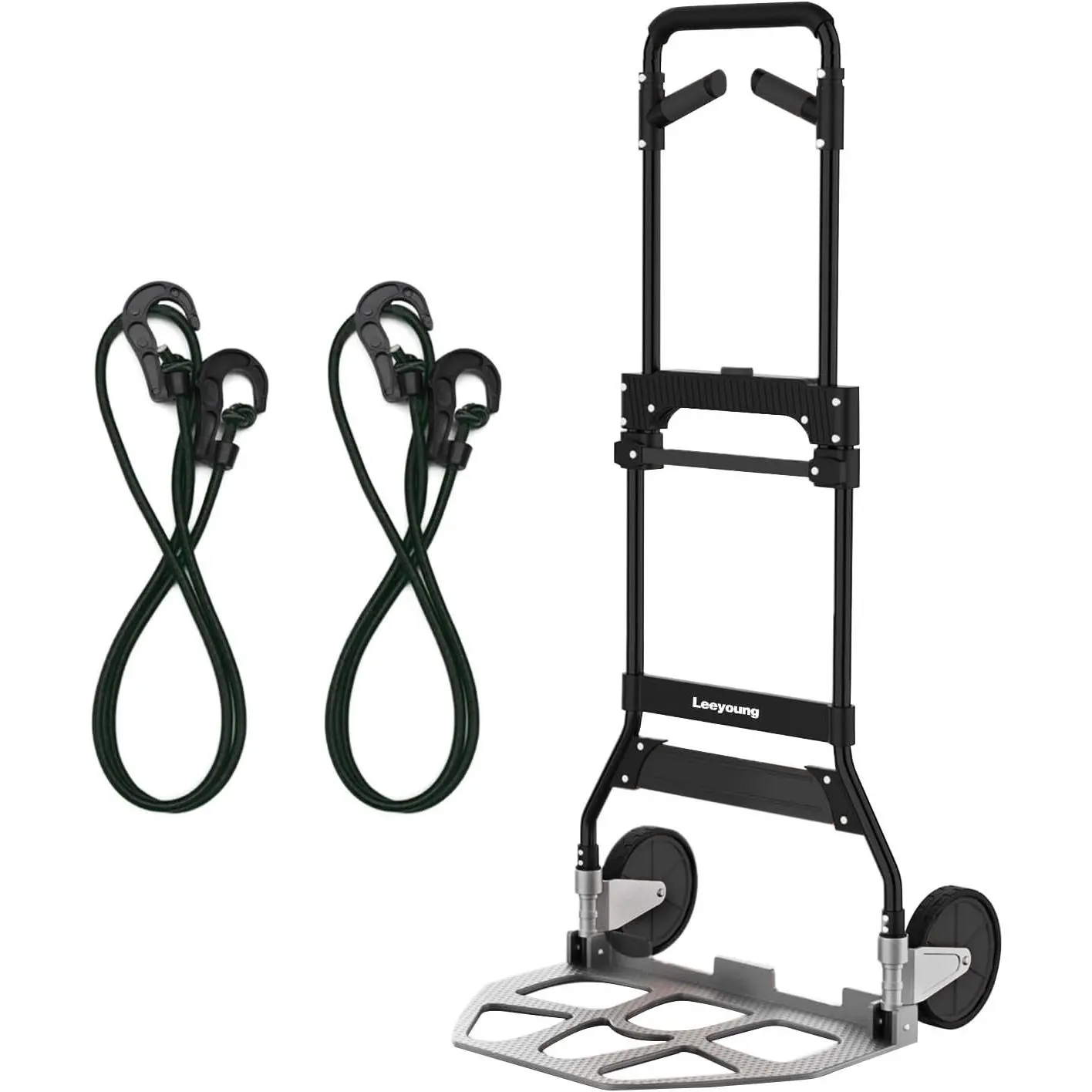 1.Heavy Duty 375lb Capacity Hand Truck Dolly: This heavy-duty dolly cart is designed to handle even the largest loads with ease.Ideal for moving furniture, appliances, boxes, or garden tools.Whether you're a home mover, warehouse worker, or DIY enthusiast, this folding hand truck ensures you can move heavy items effortlessly while maintaining full stability and control.2.Upgraded Aluminum Wheel Bracket for Durability: This two-wheel dolly features a high-quality steel frame, upgraded to an aluminum wheel bracket for added strength and durability.The 6.7-inch anti-slip wheels with a pattern friction surface ensure smooth, stable movement even on uneven surfaces like grass, gravel, or pavement.Perfect for indoor and outdoor use, whether you're transporting bulk pet food, groceries, or moving potted plants.3.Compact & Foldable for Easy Storage: The foldable dolly cart collapses down to just 2 inches thick, making it incredibly space-saving and easy to store.It fits easily in car trunks, closets, or any small storage area.Whether you need it at home, in the garage, or on the go, this compact collapsible hand truck can be stored without taking up valuable space, making it a practical solution for any home or office.4.Multi-Functional & Ideal for Moving, Shopping, and Travel: This folding hand truck is not just for moving.It’s a versatile dolly cart for shopping, traveling, and even warehouse use.Its PP + EVA wheels roll smoothly on both indoor floors and outdoor surfaces, ensuring a smooth and easy transport experience no matter where you are.Whether you’re moving boxes, hauling groceries, or transporting luggage, this portable hand truck is the perfect solution.5.365-Day Warranty & Additional Accessories: We stand behind the quality of our heavy-duty folding hand truck, offering a 365-day warranty for peace of mind.In addition, we include 2 elastic ropes to enhance your moving experience, providing extra flexibility when securing your items.Perfect for both indoor and outdoor tasks, this fold‑flat hand cart is ideal for home use, warehouse work, moving, and DIY projects.