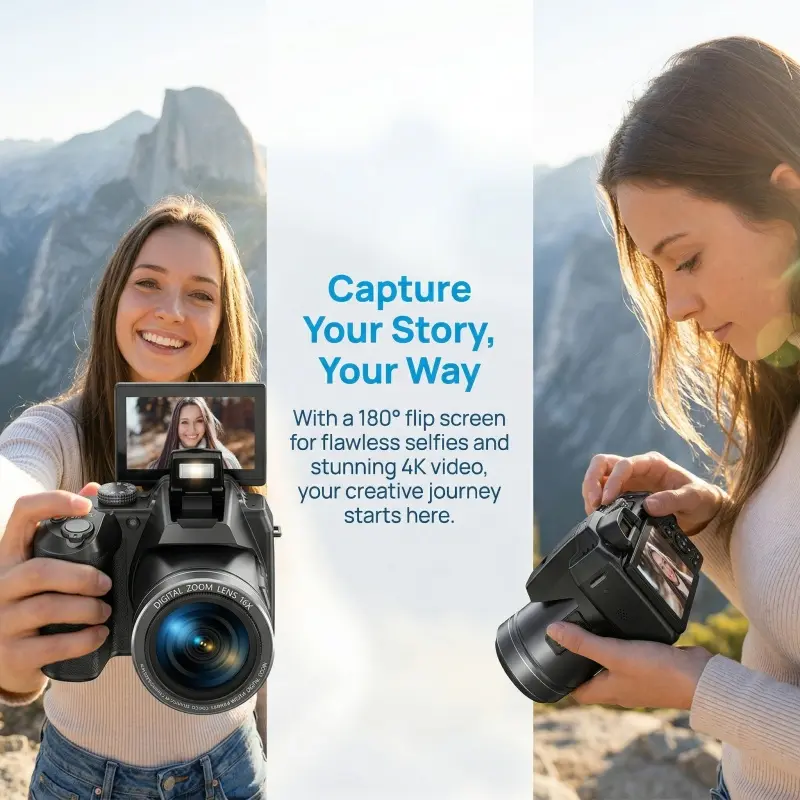 Equipped with smooth 12X digital zoom, this camera is perfect for travel, wildlife, and daily photography. The 2.8-inch 180° flip LCD screen allows for easy framing and selfie shooting, while built-in anti-shake technology helps reduce blur, ensuring stable photos and videos for vlogging.