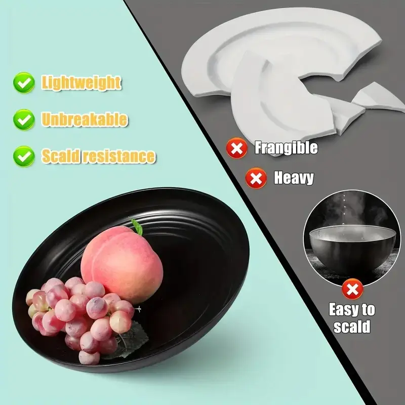 LIGHTWEIGHT AND NON-BREAKABLE DISHES: OUrdinnerware sets are designed to be space-saving withsmooth rounded edges.They are all light to pick up andsuper sturdy, so they won't break even if you drop them onthe floor!No more worrying about breaking, chipping ordropping heavy utensils, safe for and adults alike