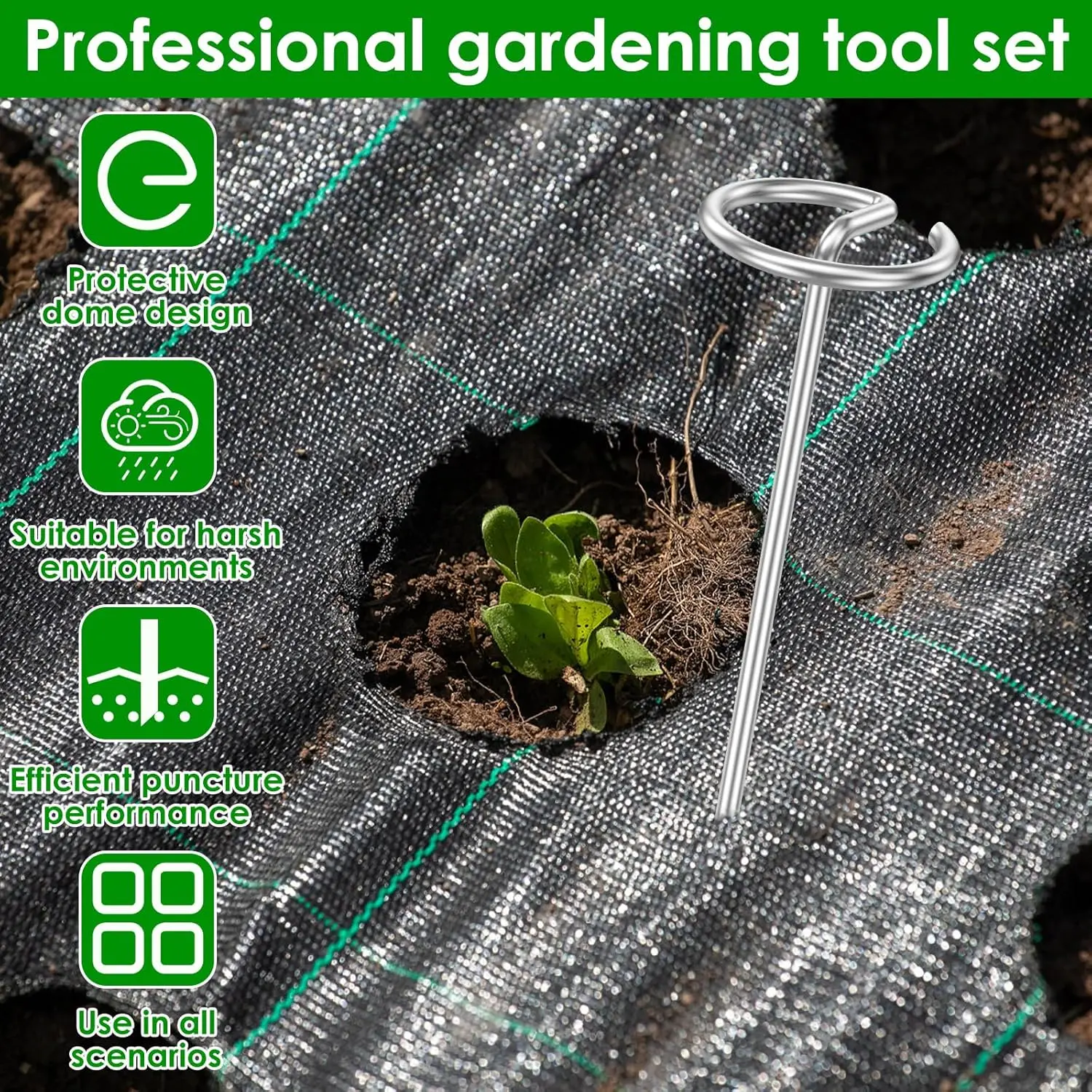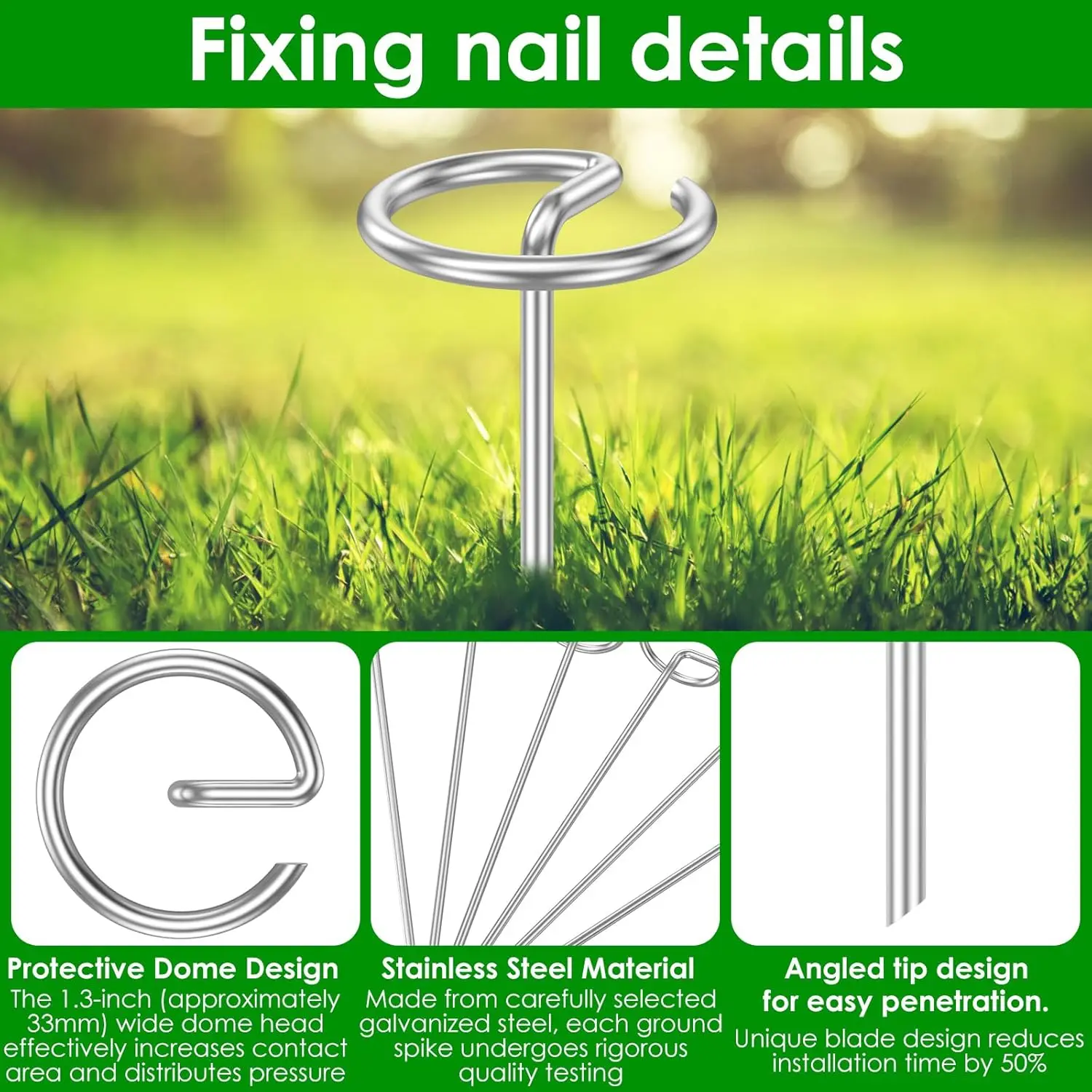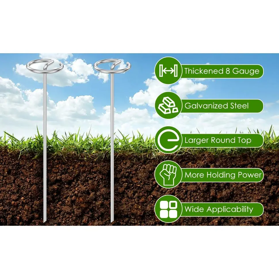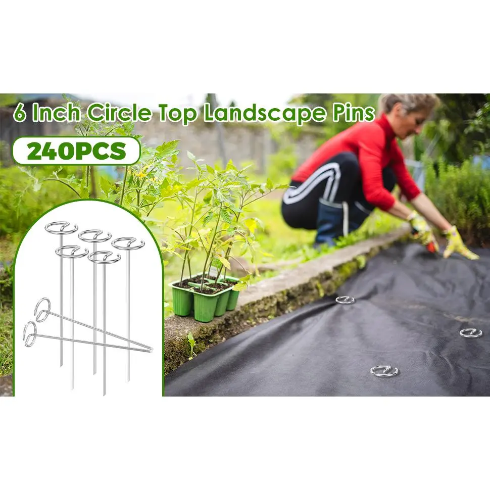 [Great Value 240-Piece Set] These landscape staples 6 inch includes 240 high-strength ground stakes and 2 multi-functional stake puller hook, meeting various outdoor fastening needs.Crafted from selected high-quality galvanized steel, each garden stake undergoes strict quality testing to ensure reliable holding power for both temporary setups and long-term landscaping projects, significantly reducing replacement frequency.[Protective Dome Design]Landscape fabric pins feature a 1.3-inch (approx.33mm) wide dome head.This head increases the contact area and disperses pressure to prevent tearing of landscape fabric, tarps, and other materials.They also have specially treated edges that ensure secure installation and allow easy removal without damage, perfectly combining protection and convenience.[Long-Lasting Anti-Rust Galvanization]Galvanized steel garden stakes undergo a hot-dip galvanization process that far exceeds standard galvanization.They offer excellent corrosion and water resistance.They suit harsh environments like damp soil, rain, and snow and last over five times longer than ordinary iron stakes.[High-Efficiency Performance]With these landscape fabric staples, you can drive them directly into compacted soil, fabric, and mulch-no pre-drilling needed.Their precision-ground angled tip and unique blade design work together to slash your installation time in half for maximum efficiency.[Versatile Application]Suitable for various applications including landscaping project securing, temporary tent pitching, agricultural weed barrier installation, holiday decoration fastening, pet fence installation, and utility line securing. Whether for home gardens or professional farms, from camping trips to construction sites, these weed barrier stakes play a vital role.