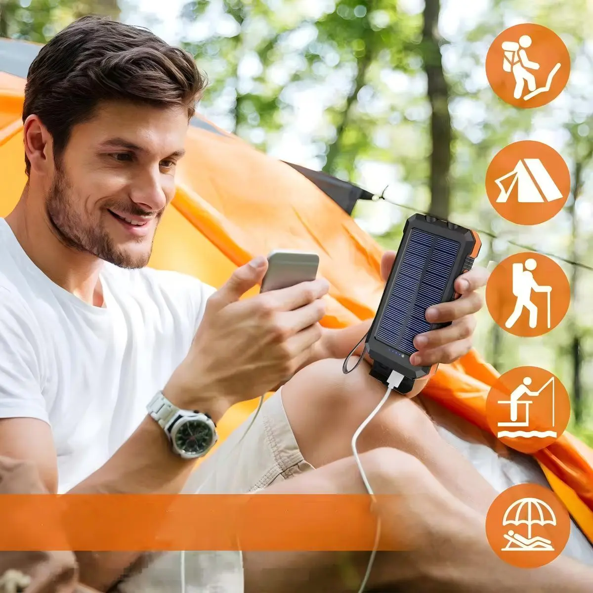 Introducing our 20000mAh Solar Power Bank – your ultimate outdoor companion designed to keep your devices powered, no matter how far off the grid you go. Built for campers, hikers, and outdoor enthusiasts, this portable charger combines reliable solar charging, practical functionality, and durable design to solve your power worries during every adventure.
