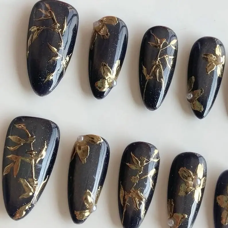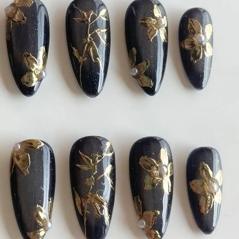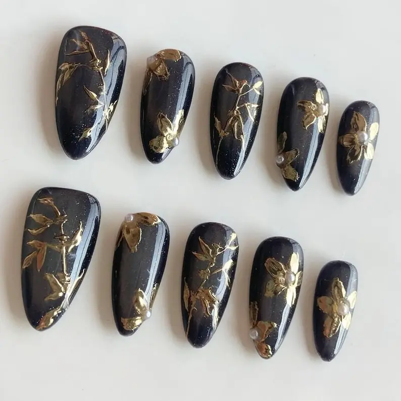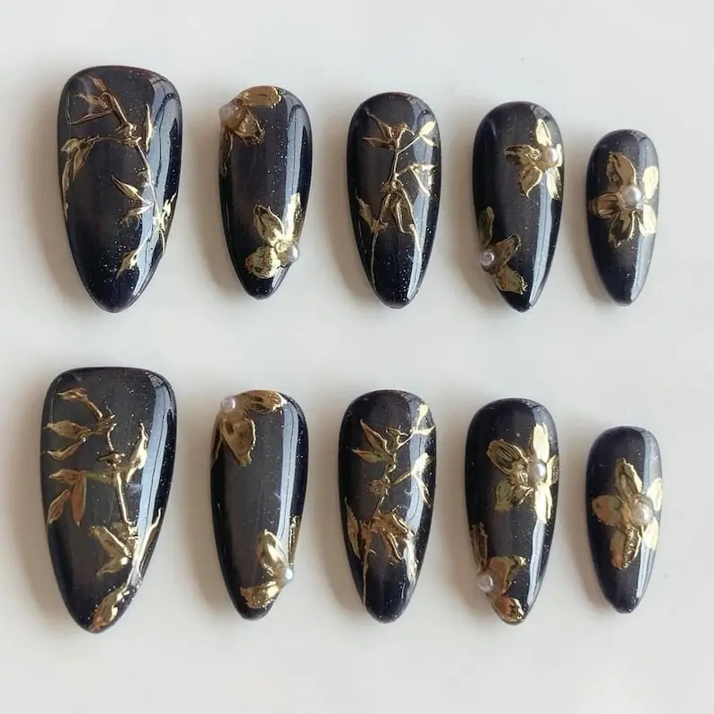 Elegant Black Press On Nails with Gold Floral Design, Handmade Vintage Glam Nails with Pearls, Reusable Luxury Nail Art Set, Daily Nails.