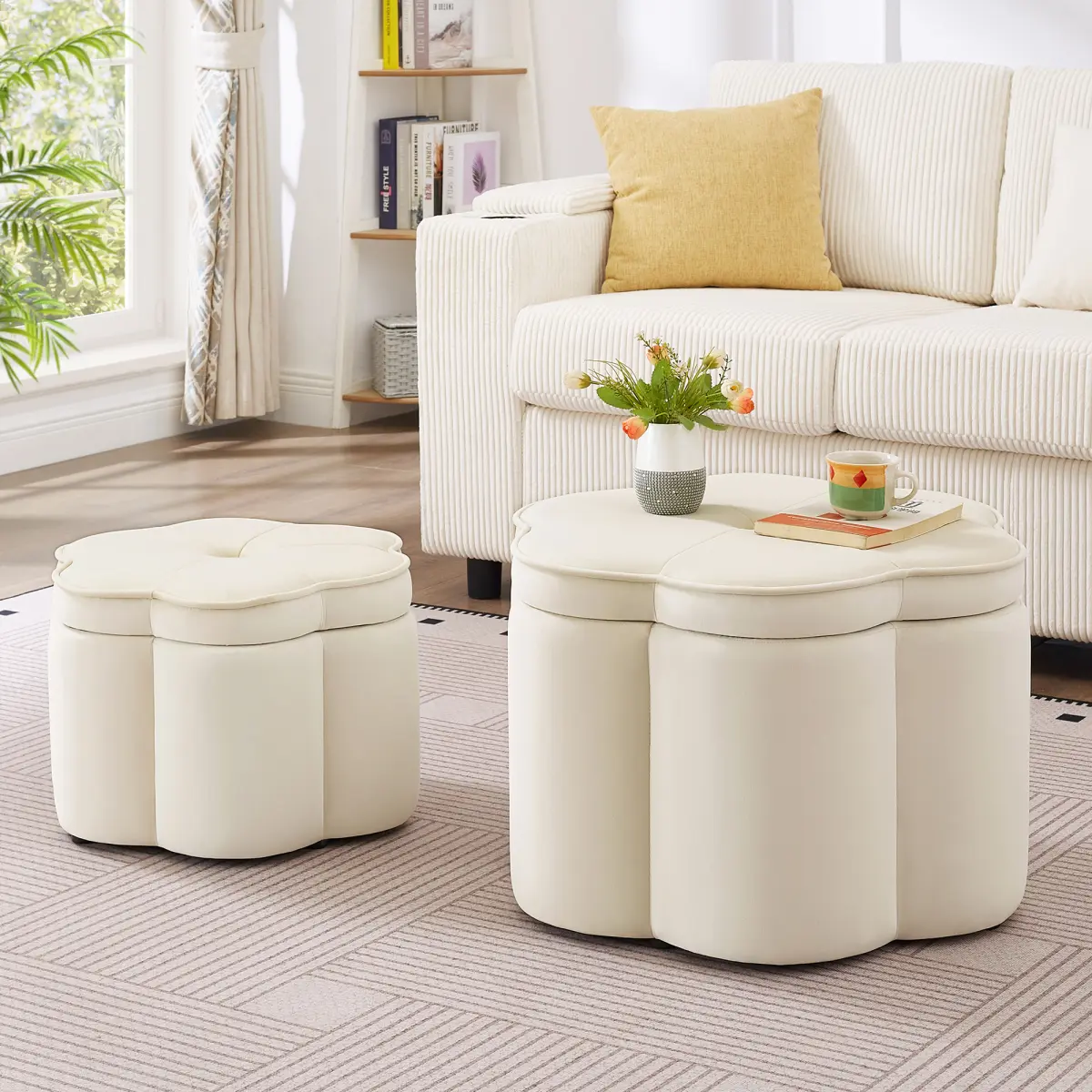 ·[Enchanting 6-Petal Flower Design] This ottoman set brings a whimsical, aesthetic centerpiece to any room.Featuring a unique six-petal flower shape, it adds a soft, sculptural touch to your decor.The innovative nesting design allows the smaller ottoman to tuck neatly inside the larger one, providing a brilliant space-saving solution when not in use, making it both charming and practical.