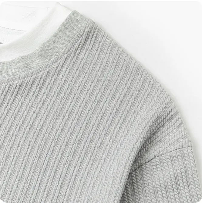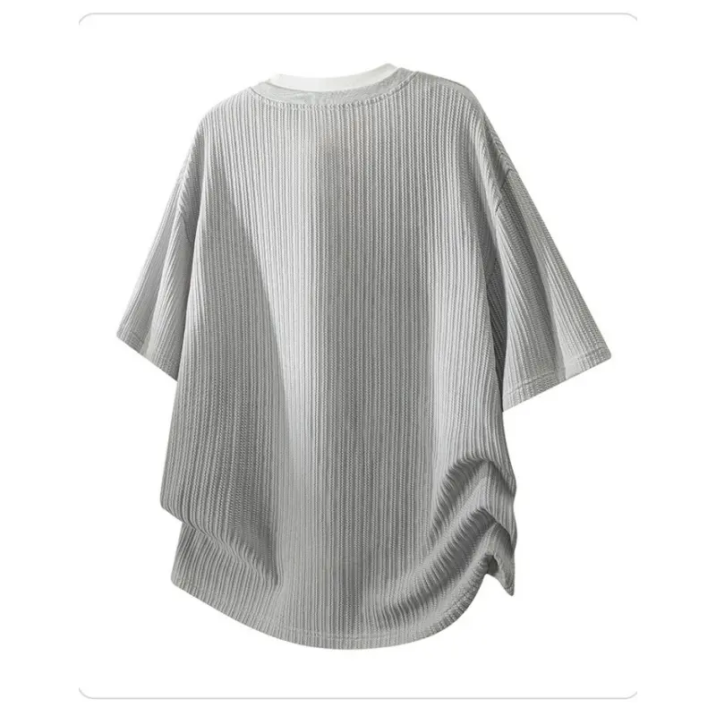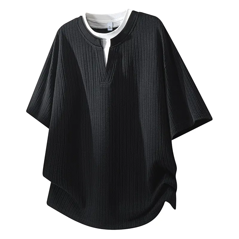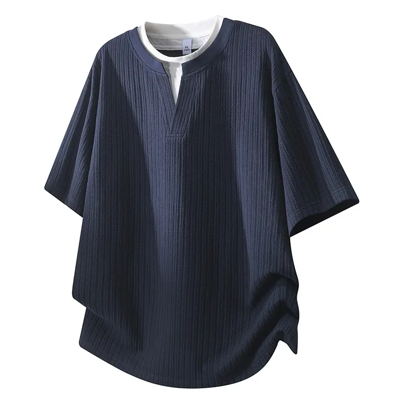 Men’s solid-color V-neck faux two-piece short-sleeve T-shirt with a stylish jacquard texture; casual athletic design that is simple, versatile, comfortable, and breathable—ideal for work commutes, outdoor activities, and everyday home wear.