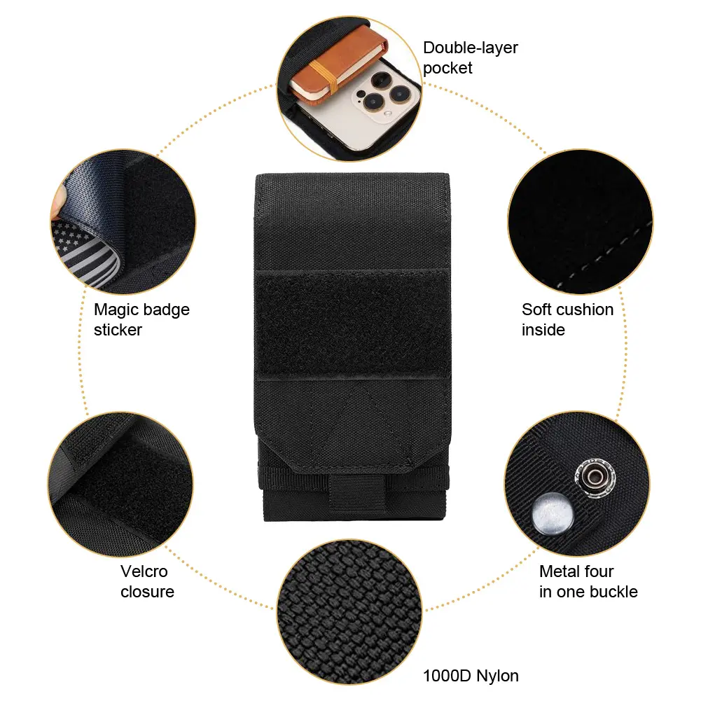 This double-layered phone case is designed for two phones. It features a belt clip pouch holder and a tactical cell phone holster with a belt loop. Perfect for working, outdoor living, or hiking. The case is black and includes a waist pocket.