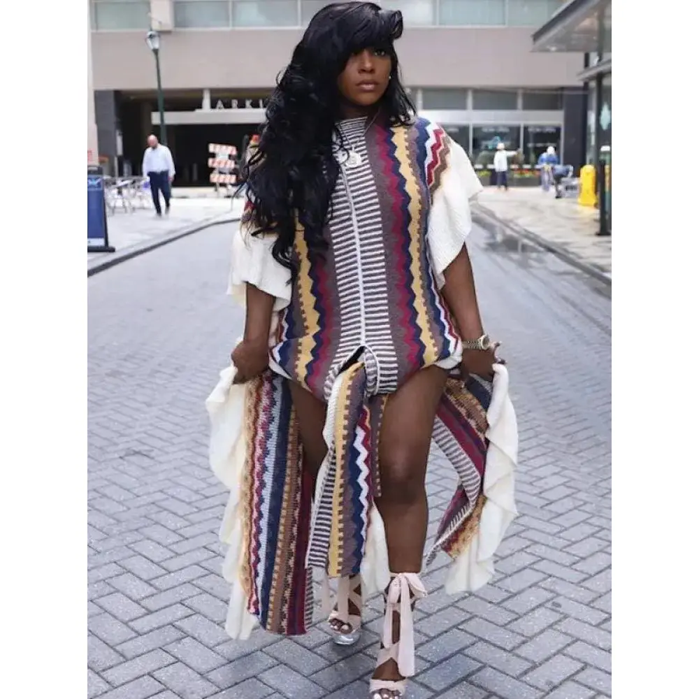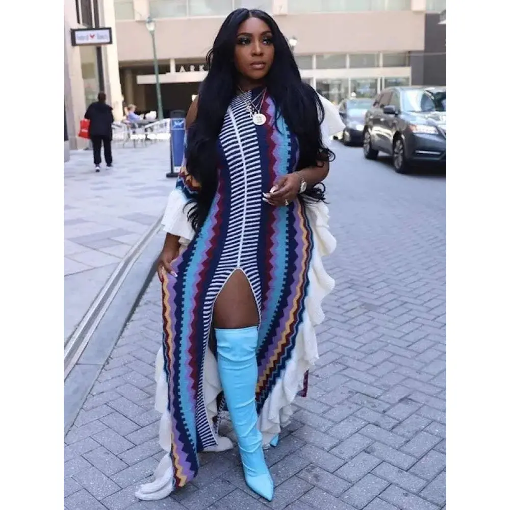 Nod to the split hem and balanced design!This casual split hem ruffled striped dress is a must have item!High quality and textured.This fit runs casual but remains comfortable.