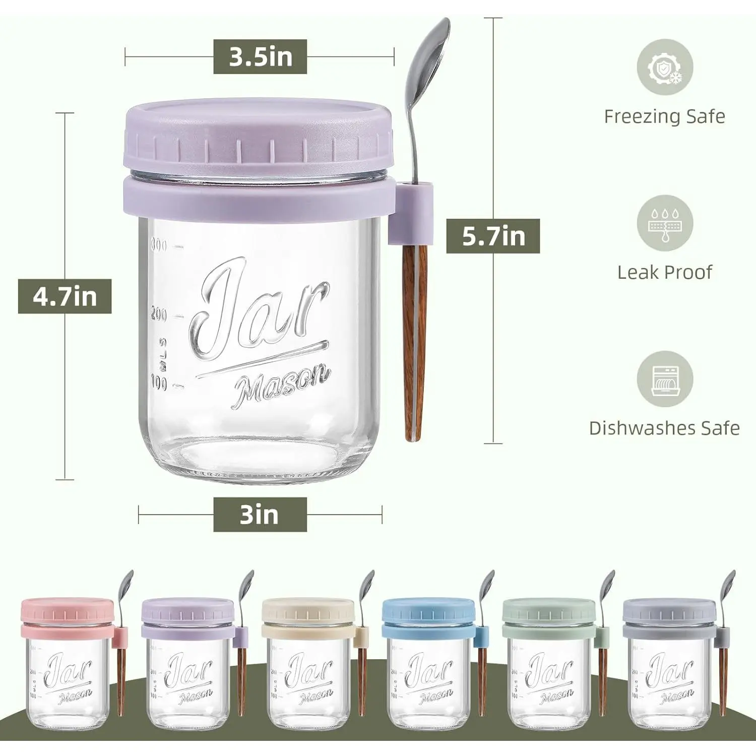 PREMIUM MATERIALS WITH PROPER SIZE: The package contains 6 jars in 6 colors, with screw-on lids and spoon holders with stainless steel spoons, each of 16oz.The jars are made of high-quality sturdy borosilicate glass which is totally , and lids are PP and with no lead.They stay safe in dishwasher and refrigerator.