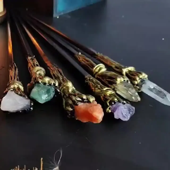 Each wand features a polished wooden handle with a natural crystal tip (Green, Clear, Purple, Yellow, Pink crystals available). The elegant, slender design gives it an authentic witchy aesthetic, perfect for magic-themed looks.