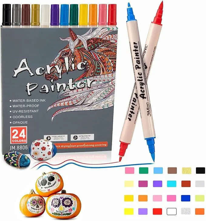 Dual-tip acrylic paint pens: Our paint brushes have a 5mm soft brush tip and a 1mm fine tip. You can use the 1 mm nib for drawing lines and the 1-5 mm nib for filling in large areas. Giving you more convenience in your creations with dual-tip brushes.