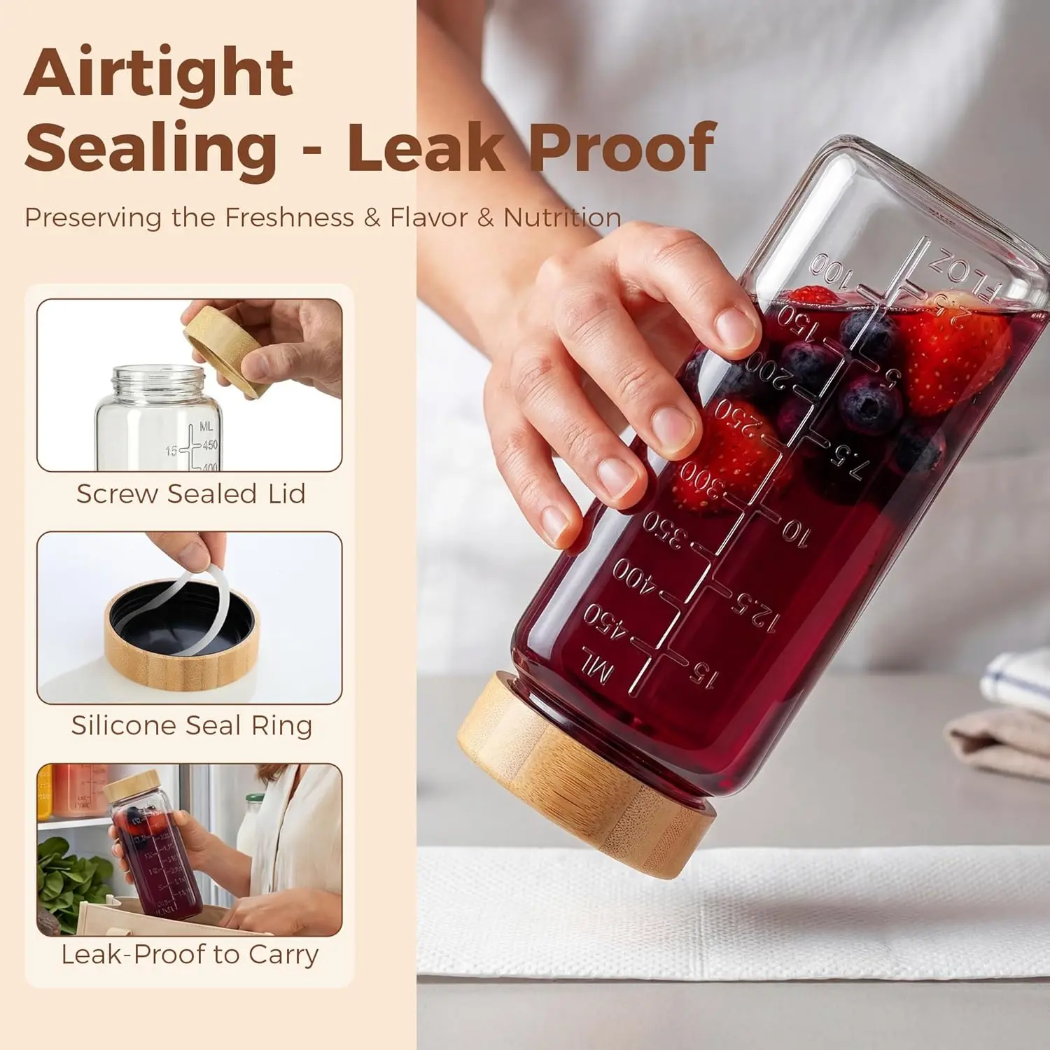 ·[ Premium Glass Jars for Food Safe Storage ]: Crafted from BPA-free & Lead-free food grade glass, these reusable juice containers ensure safe & healthy juice storage. The bamboo lids add a natural aesthetic, eco-conscious touch, providing a sustainable, airtight seal. Safe for use in the dishwasher and the refrigerator, our glass juice jars are built to last, while also supporting your commitment to reducing single-use plastics with every drink