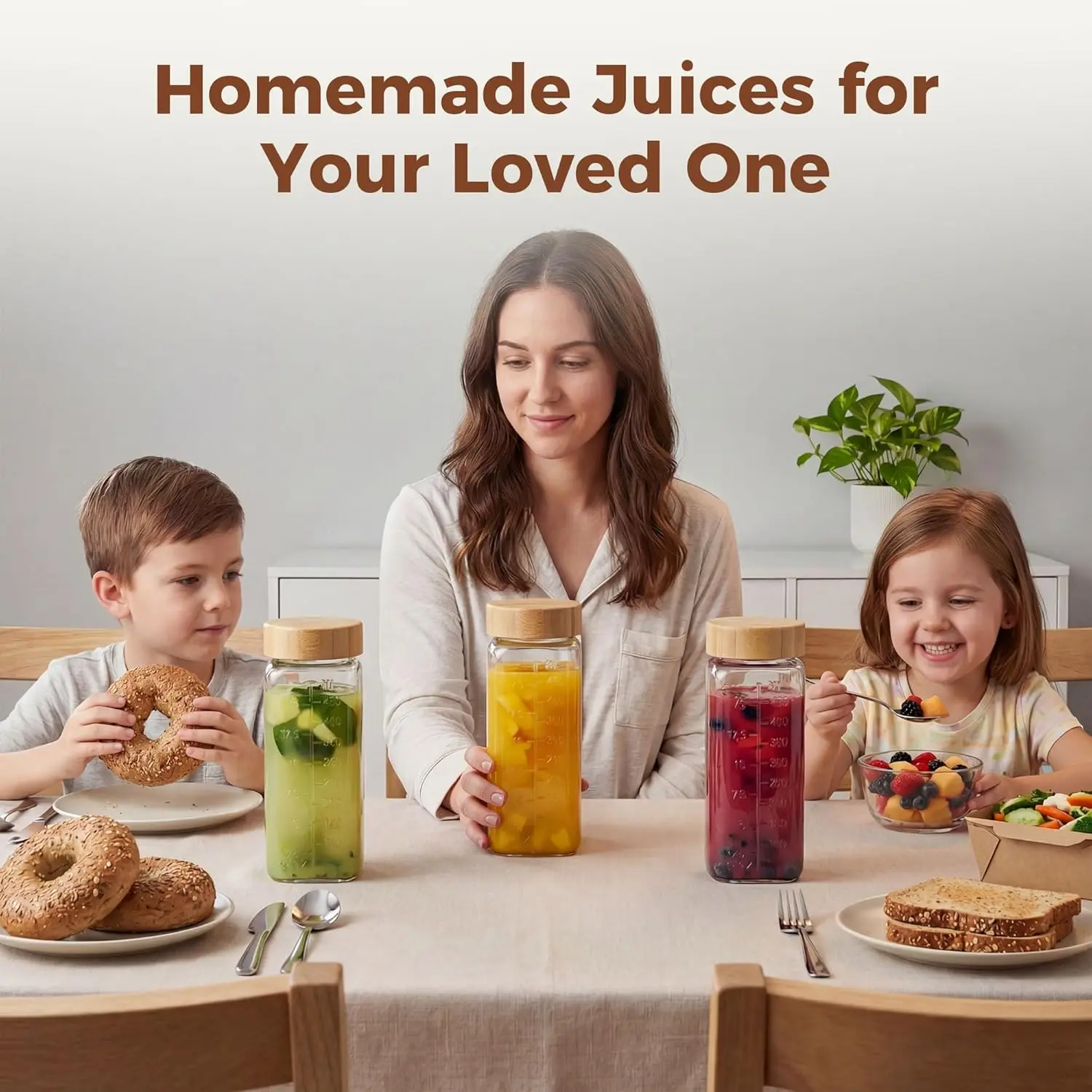 16oz Square Glass Juice Bottles with Lids, 3 Pack Reusable Juice Containers with Bamboo Lids