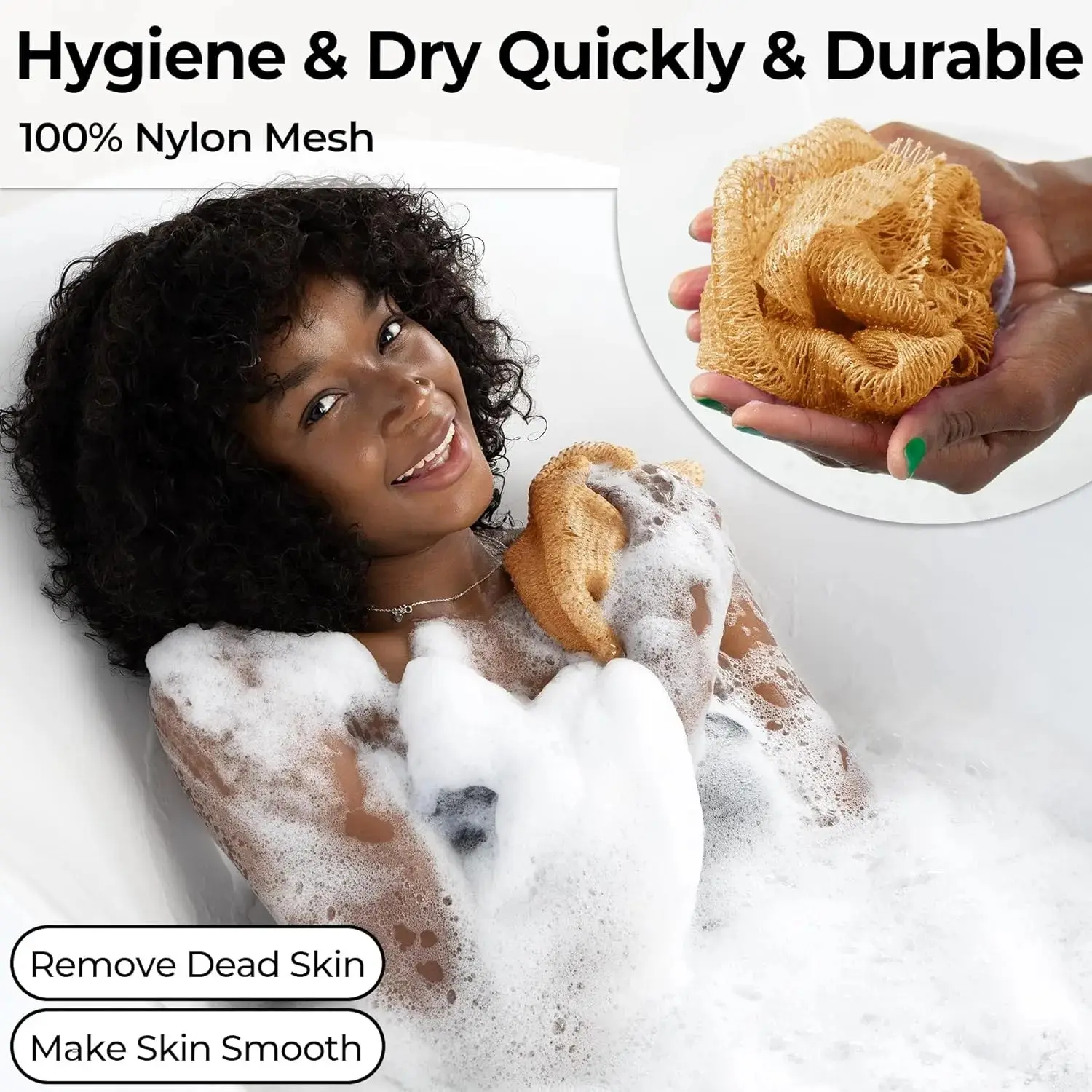 The bath net sponges are designed with white strings on both ends, making it easy to hang and air dry. It's super stretchable and the length is perfect for reaching your back and other hard-to-reach areas with ease. Made from durable, porous, and hygienic material, this net sponge dries quickly, minimizing bacterial growth and outperforming traditional loofahs and washcloths.