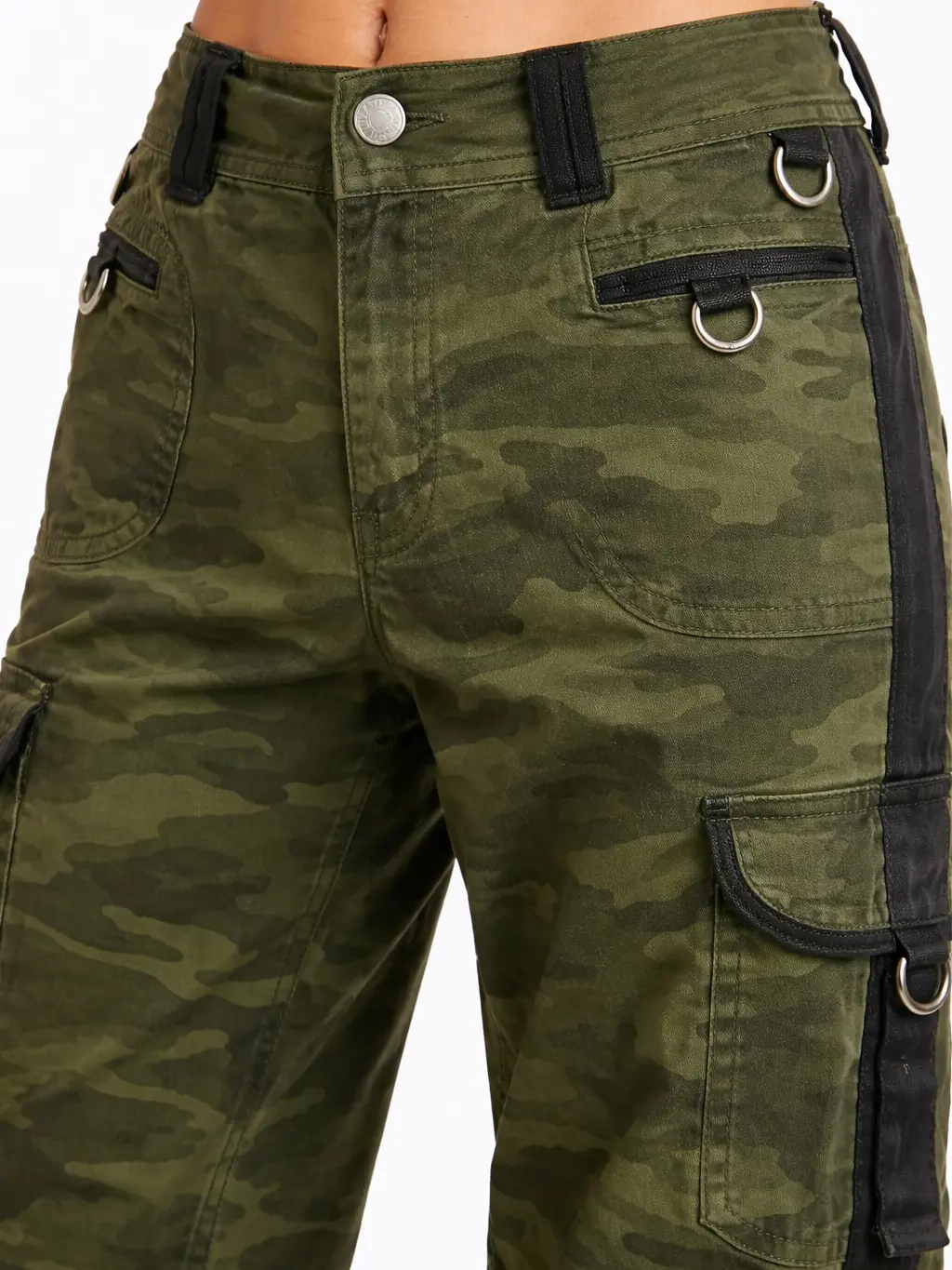 Edgy, functional, and easy to style, these olive camo cargo pants bring a utility-inspired finish to everyday outfits. Designed with a relaxed wide leg silhouette, statement cargo pockets, contrast side details, and hardware accents, they combine streetwear attitude with all-day wearability for a bold but easy look.