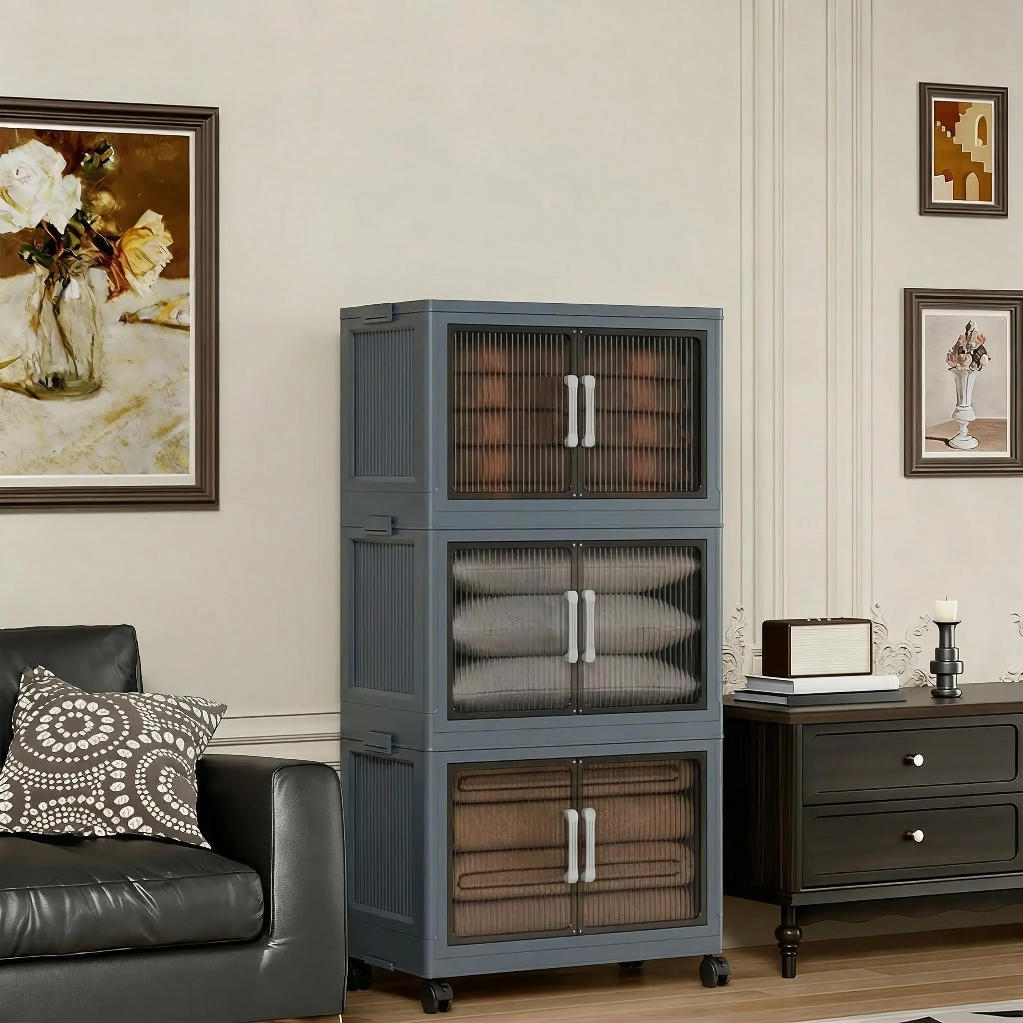 ·Stackable & Removable Design: Foldable storage bins and a stackable storage box. Each level has matching grooves and clasps on the top sides to lock the storage bins securely, and the foldable design maximizes space in your home when not in use. There are rotating wheels on the bottom for easy movement