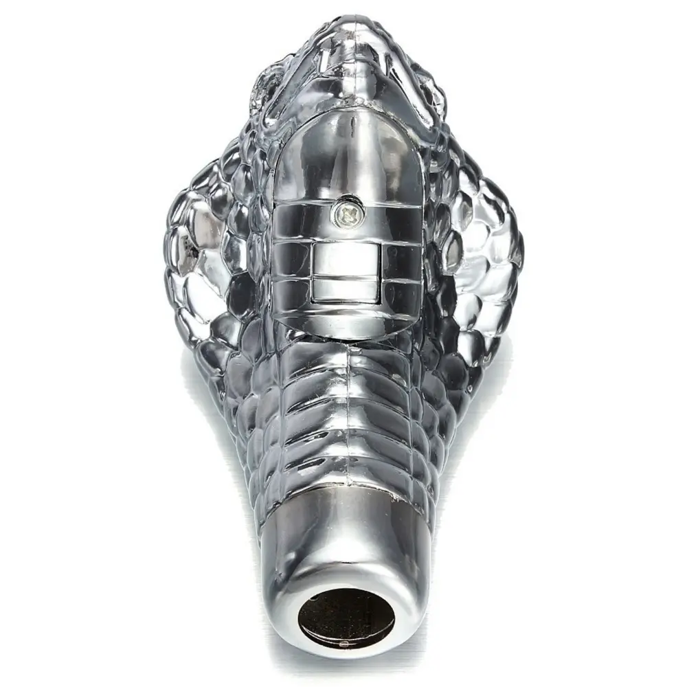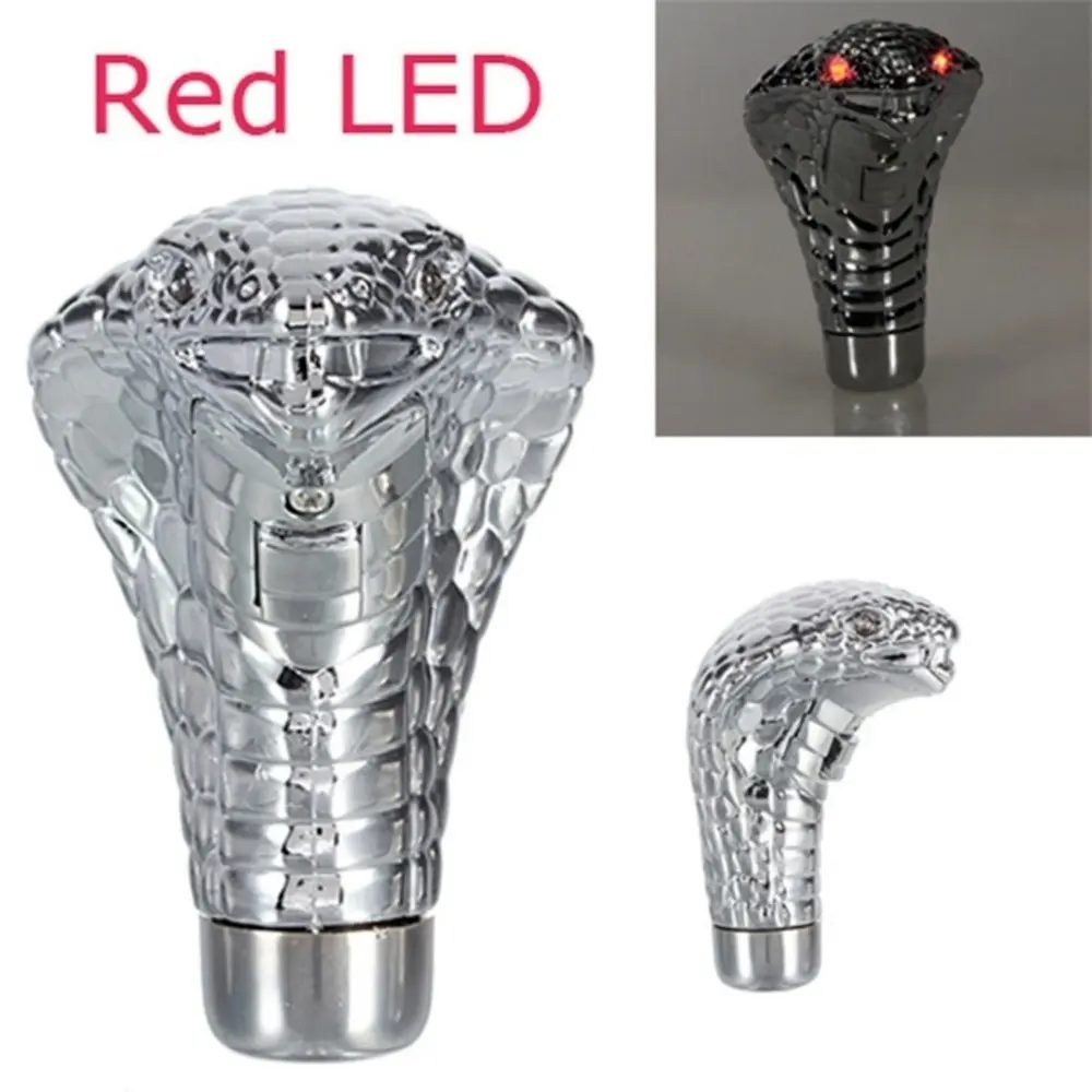 Elevate your car's interior with this Chrome Snake Gear Shift Knob. Perfect for car decoration, it fits most vehicles. Choose between red or blue lighting. Four flash modes: LED light flash, slow flash, continuous light, and off. Silver color, weighs 0.16 kg, measures 10x7x2.5 cm. Powered by 5W, with an 8mm/10mm adapter.
