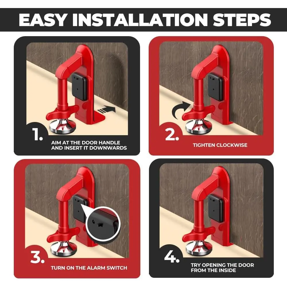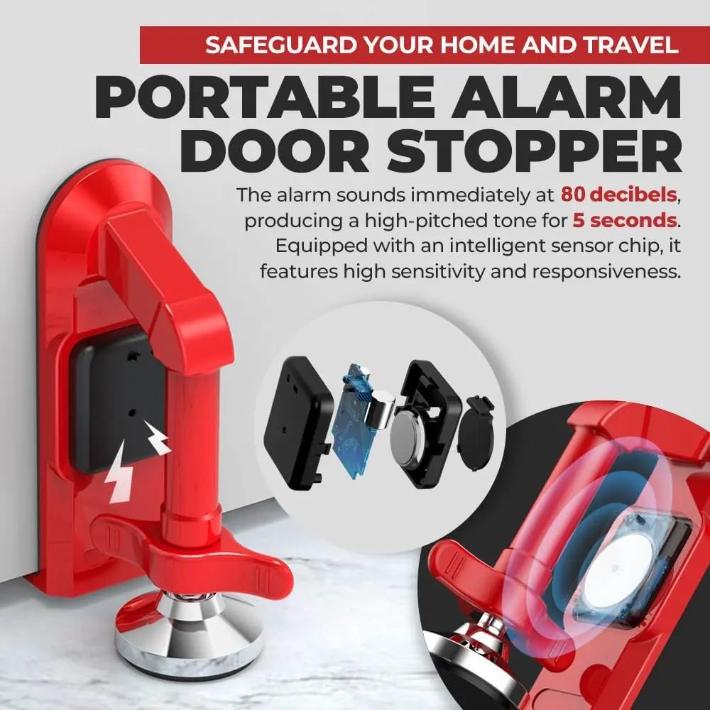 Introducing the Portable Alarm Door Stopper, your companion for enhanced security at home and on the go.This innovative device combines the simplicity of a traditional door stopper with a powerful alarm system that activates upon forced entry, providing peace of mind in any environment.Lightweight and easy to use, it fits snugly at the bottom of any door, making it perfect for everything from your front door to hotel rooms.Embrace modern security and ensure that you and your loved ones are always protected from unwanted intrusions with this essential safety tool.