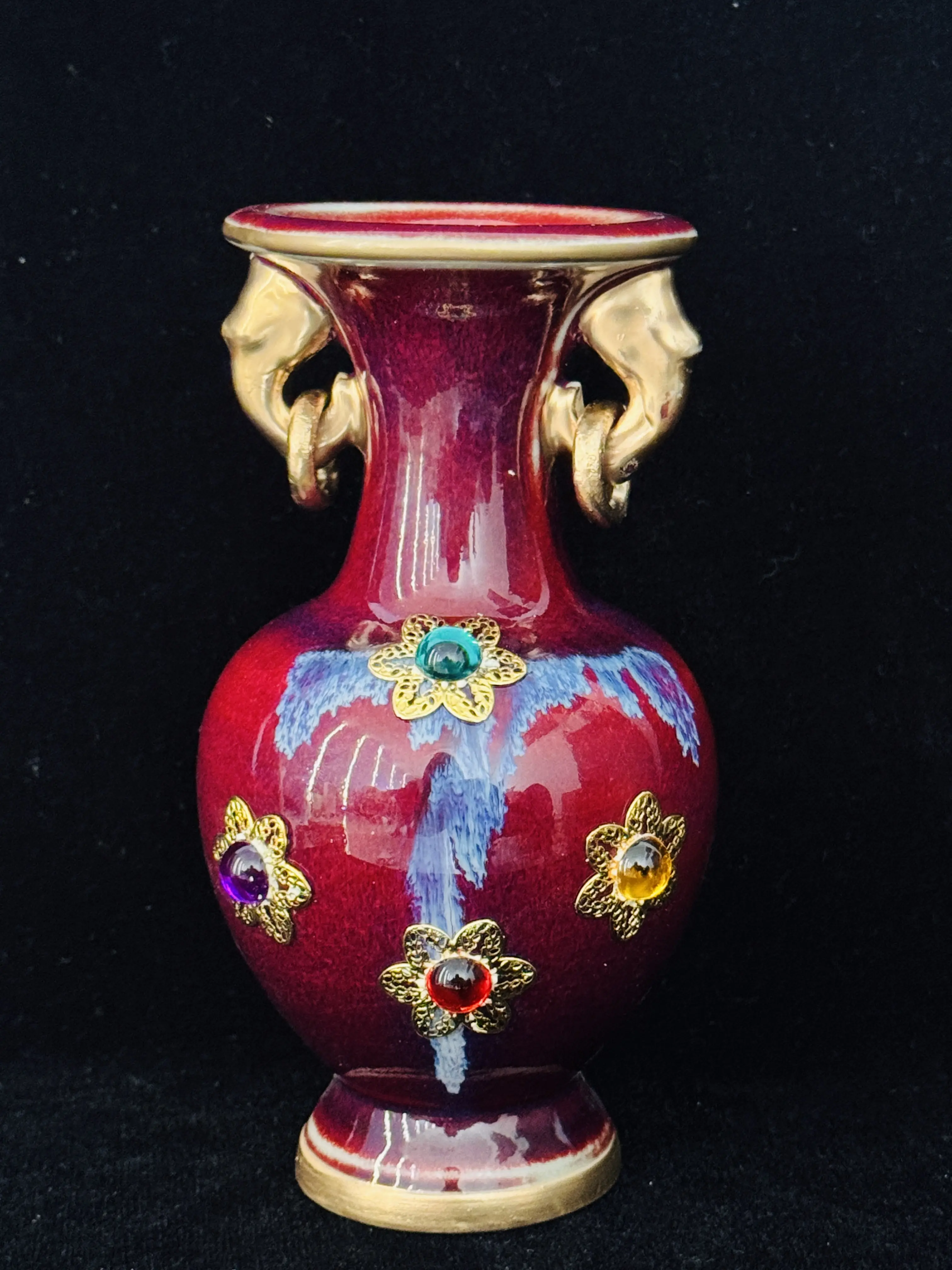 ✨ Discover the Handmade Chinese Jun Porcelain Vase, a masterpiece of Asian art. This vintage red glaze vase features gold elephant handles and gem inlays, adding a touch of luxury. Perfect for home decor, it combines tradition with modern elegance. Each piece is uniquely crafted, making it a standout addition to any space.