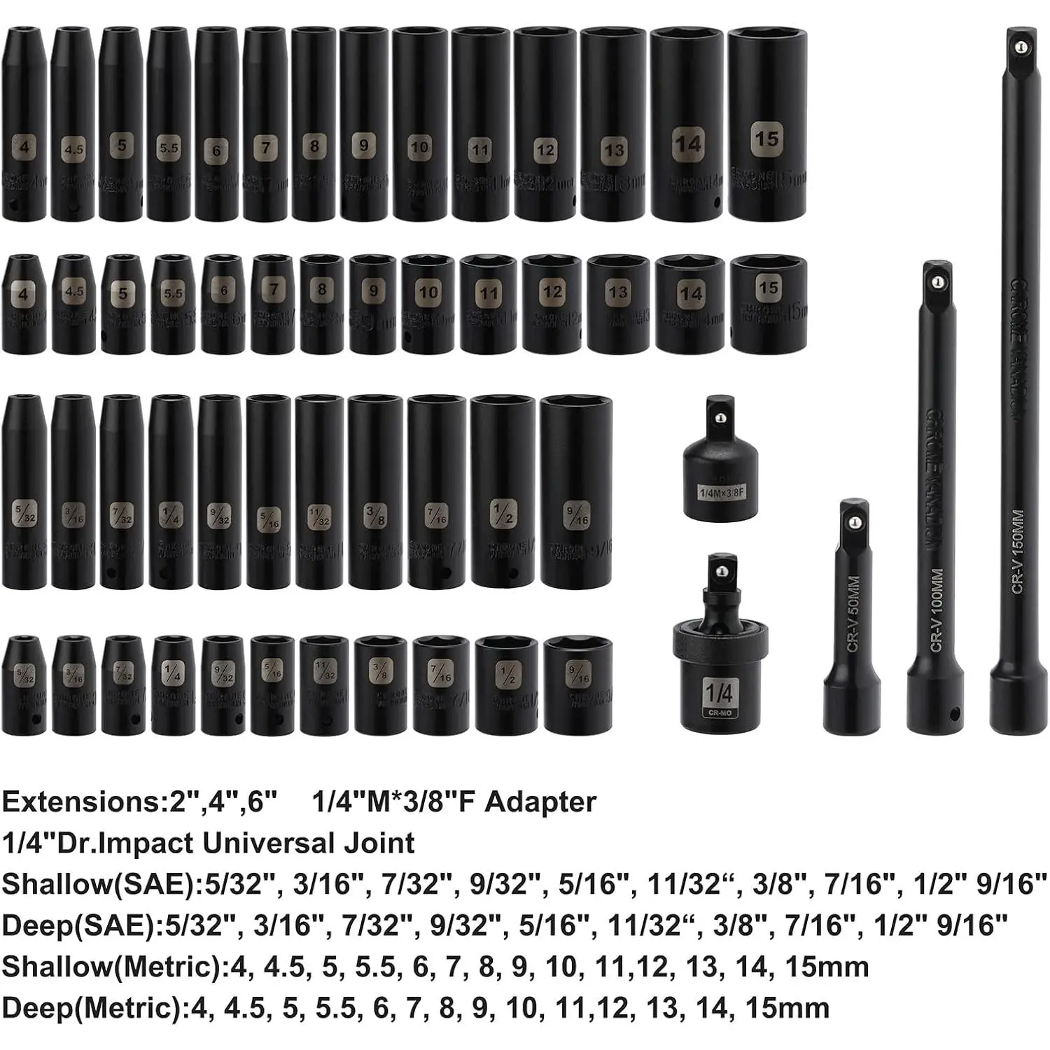 55PCS 1/4 Inch Drive Master Impact Socket Set, Metric/SAE, Deep/Shallow, 6 Point, CR-V, 5/32 Inch - 9/16 Inch, 4mm - 15mm