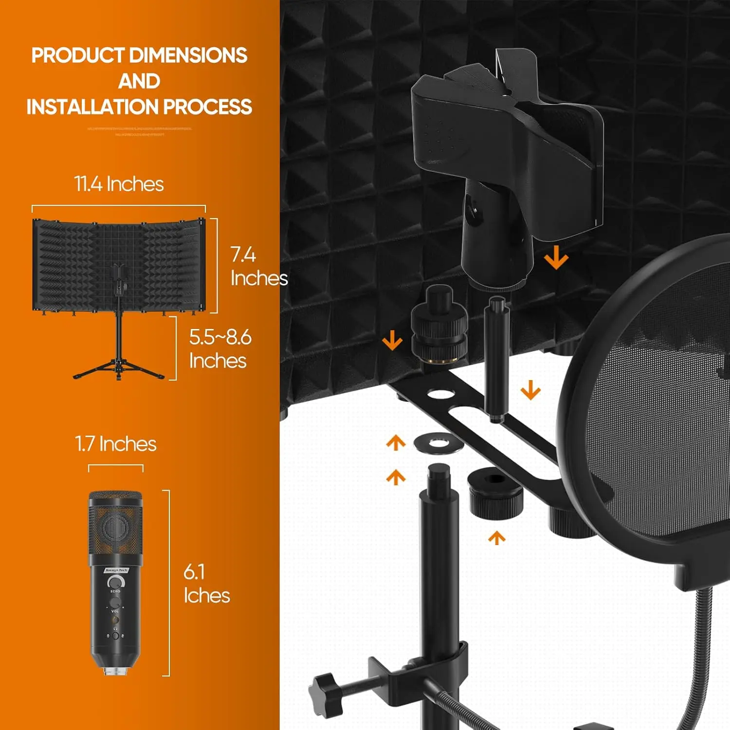 COMPATIBILITY AND VERSATILITY: The mic shield can be on a desk using the metal tripod included with the kit, or it can be mounted on a microphone stand (not included) for use.Recording microphone for singing, vocal recording, live streaming, and podcast.