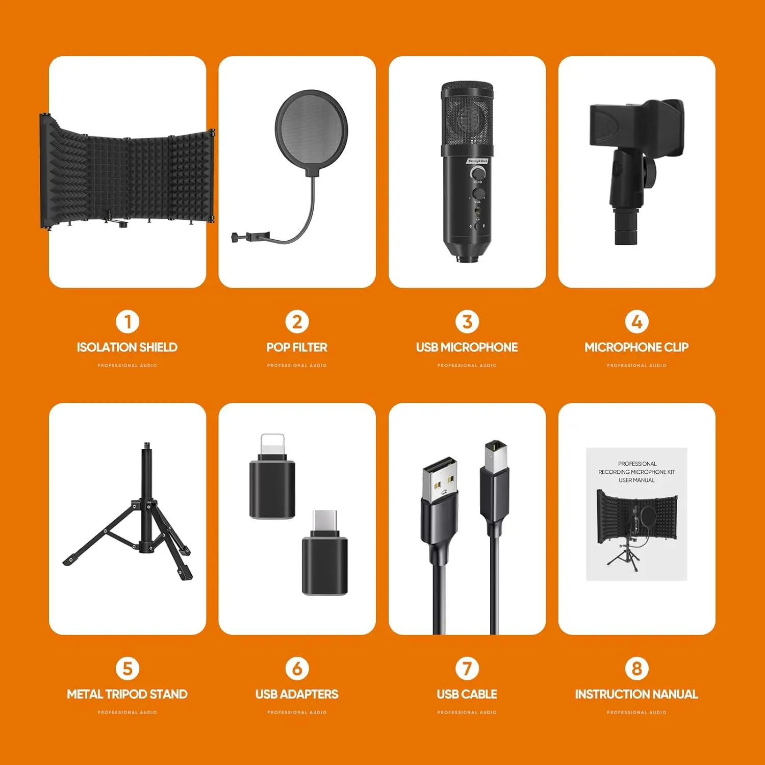 STUDIO EQUIPMENT PACKAGE LIST: This studio recording equipment includes 5-panel microphone shield*1, vocal recording microphone*1, USB microphone *1, Type-C adapter*1, metal tripod stand*1, mic clip*1, microphone filter*1, instruction manual*1. If you encounter any problems before purchasing or during use, you can contact at any time, we will serve you wholeheartedly.