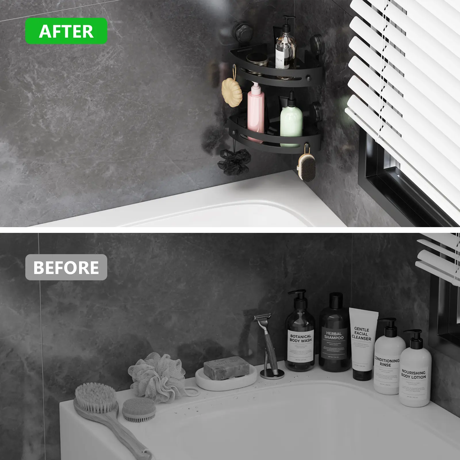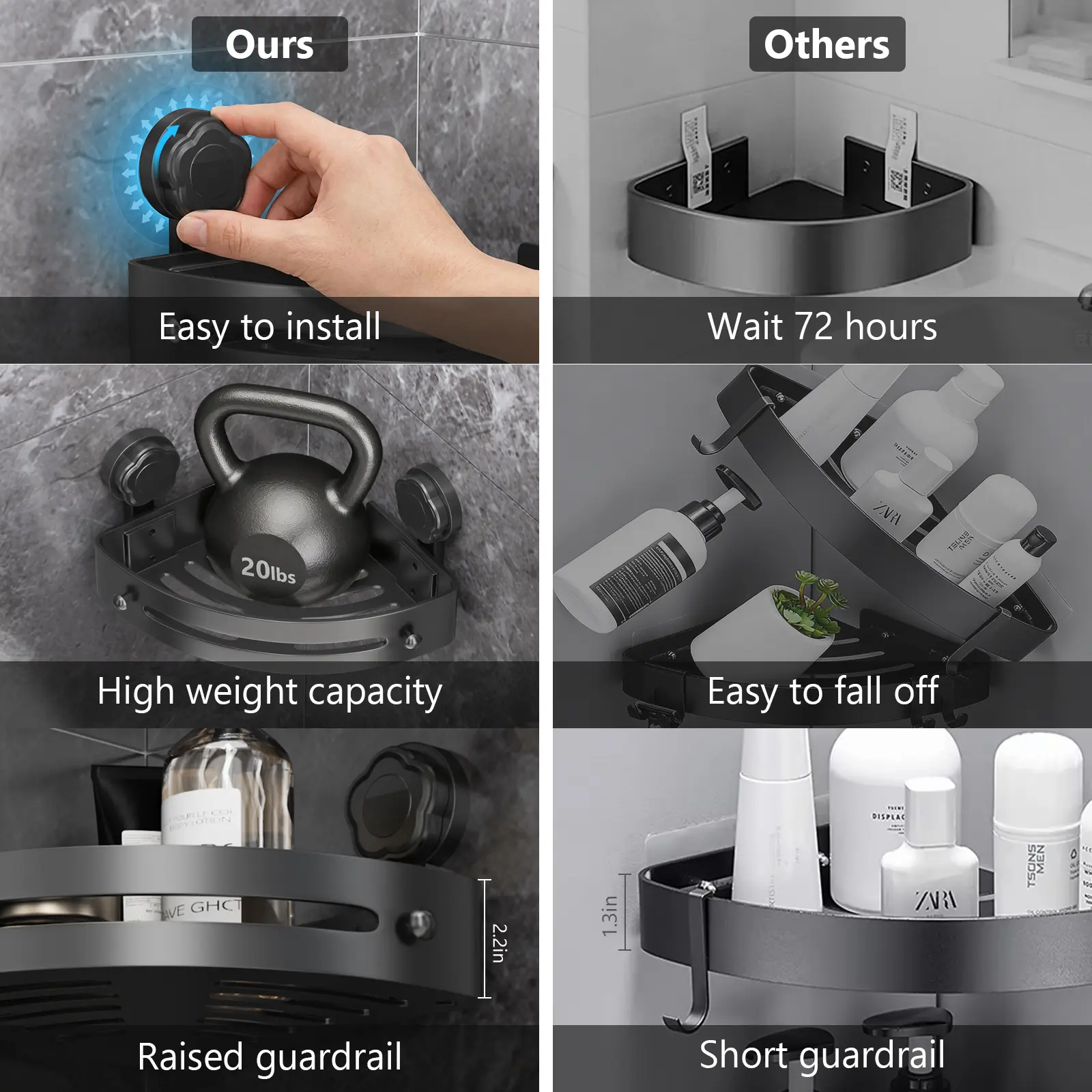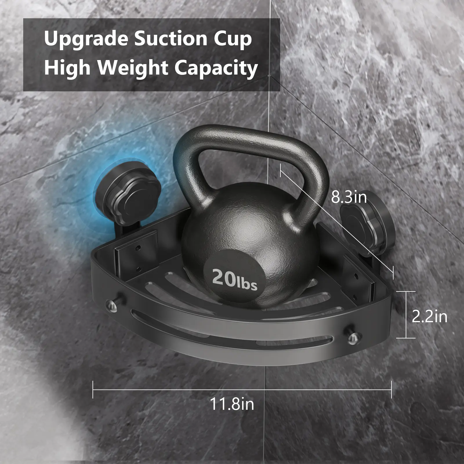 【Strong Suction & Heavy Duty】 Our upgraded vacuum suction cups create an airtight seal on smooth, non-porous surfaces (tile, glass, acrylic), holding up to 20lbs per shelf! No drilling, no damage to walls, and no falling off—stably store your shampoo, conditioner, body wash, and more with total peace of mind.
