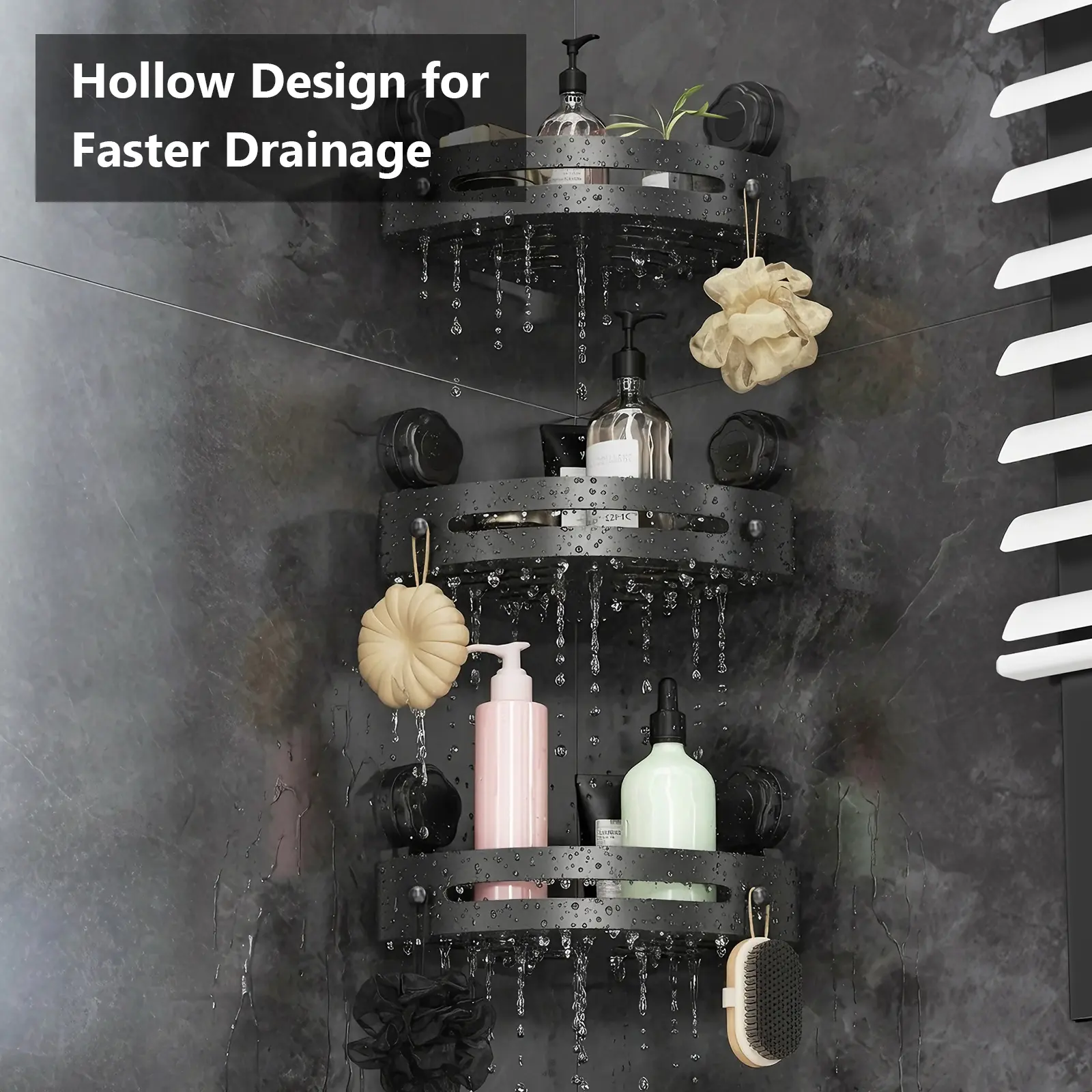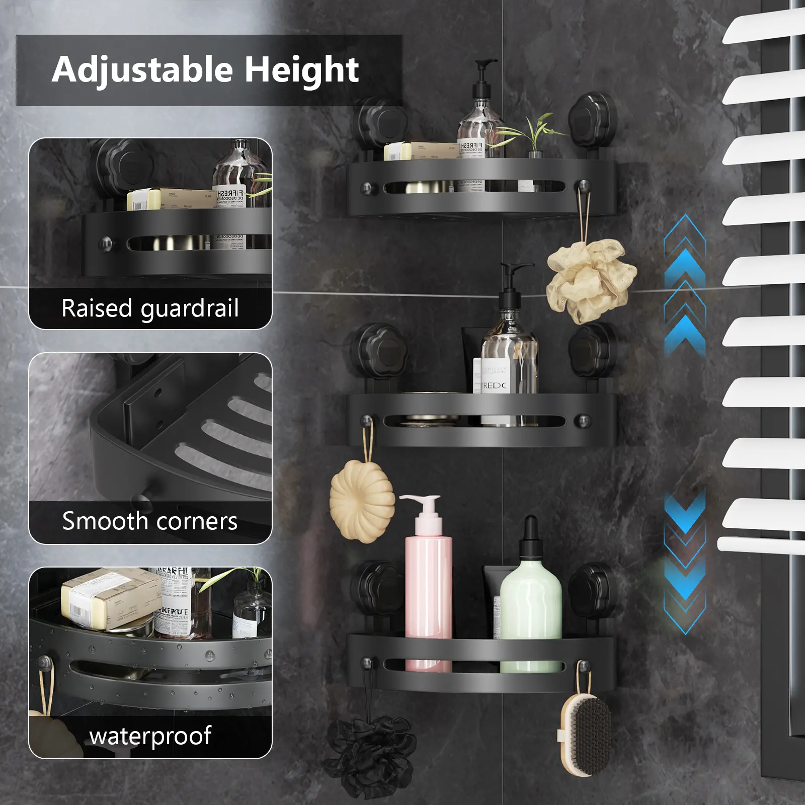 【Space-Saving 3-Tier Design】 Maximize your unused corner space with 3 spacious tiers + 6 built-in hooks! The hollow, slotted base ensures fast drainage to prevent water buildup and mold, keeping your shower essentials dry and organized at all times.【Premium Rustproof Material】 Made of thick, durable space aluminum with a matte black finish, this shower caddy is 100% rustproof, waterproof, and corrosion-resistant. The raised 2.2-inch guardrail prevents bottles from slipping, and smooth rounded corners protect you from scratches.【Adjustable & Multi-Use Organizer】 Customize the height of each shelf to fit your storage needs! Ideal for bathroom showers, bathtubs, toilets, kitchens, and even RVs. Keep your space tidy and clutter-free with this versatile, damage-free storage solution.