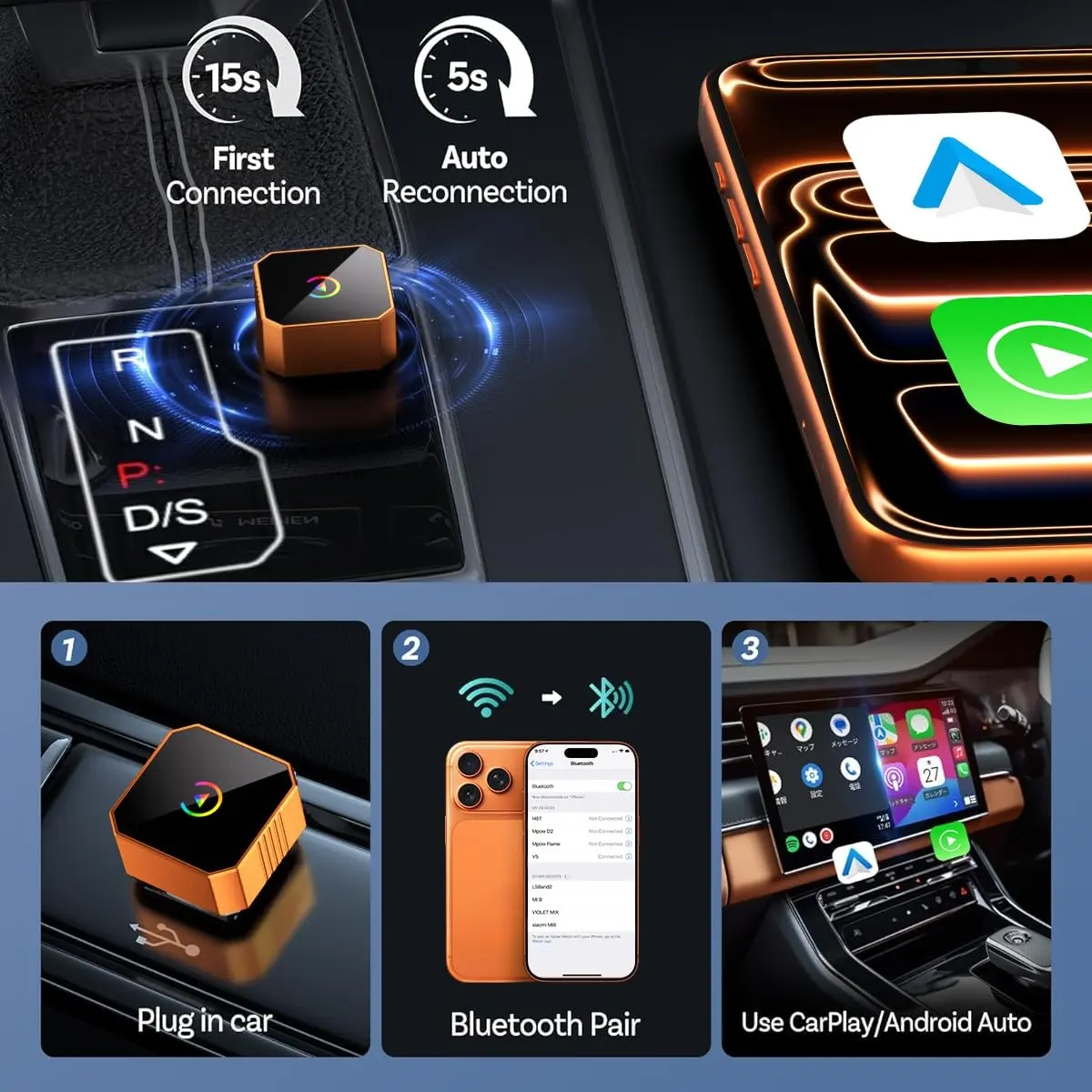 ·【Plug & Play Satellite Radio】Simply plug the wireless CarPlay adapter Compasses into your car's USB port ( ), pair via Bluetooth and WiFi, the CarPlay wireless adapter Compasses is ready to go. Featuring instant auto-reconnection every time you start your car, this adapter delivers truly plug-and-forget convenience with just one-time setup for lasting wireless freedom. Please check if the wireless adapter is plugged in stable when you used it. Make sure your car have the wired carplay before buying this item. This products only supports car have wired CarPlay and Car Audio