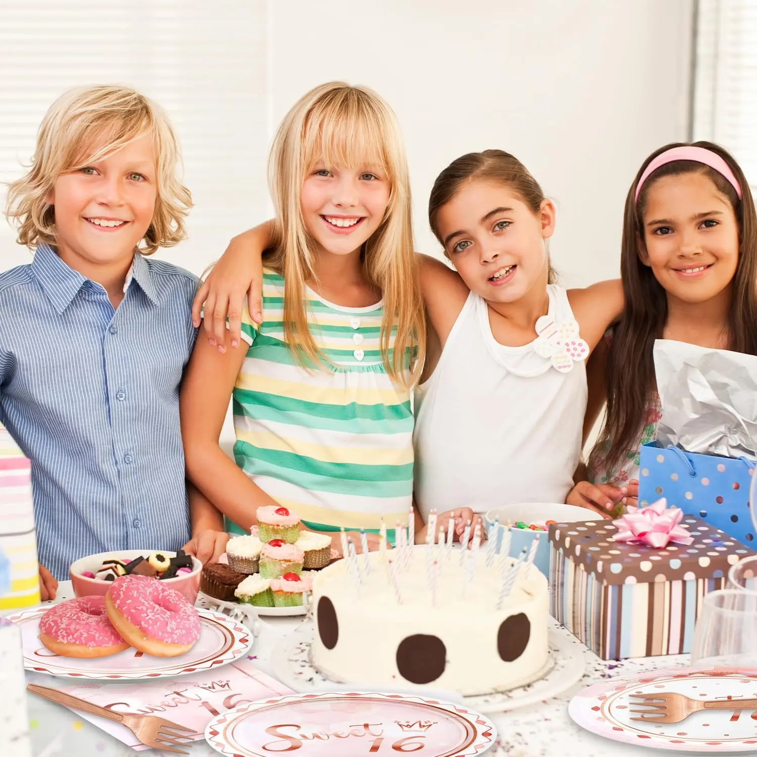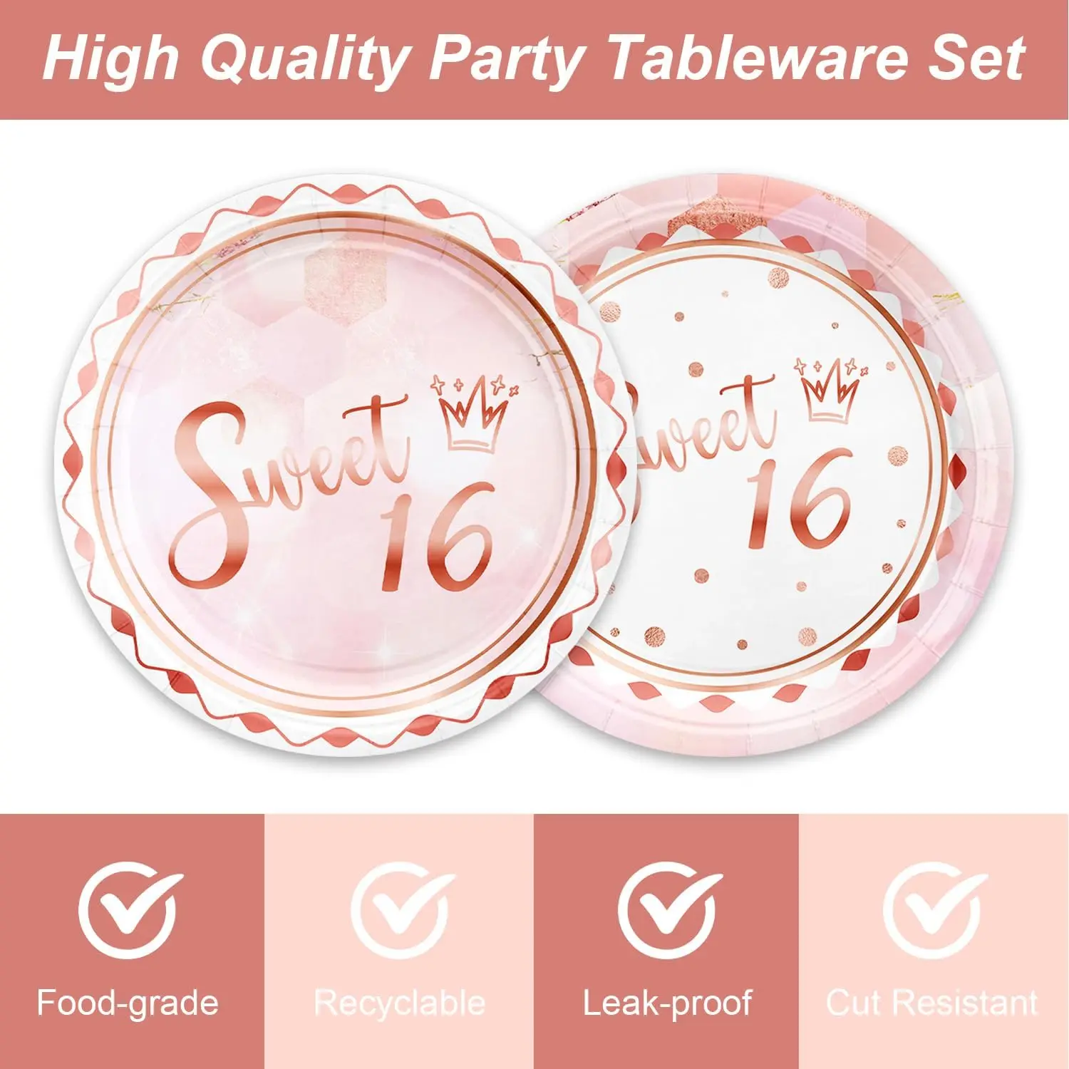 The package includes(48pcs): 16pcs sweet 16 Dessert plate 16pcs sweet 16 napkins 16pcs Rose Gold Fork