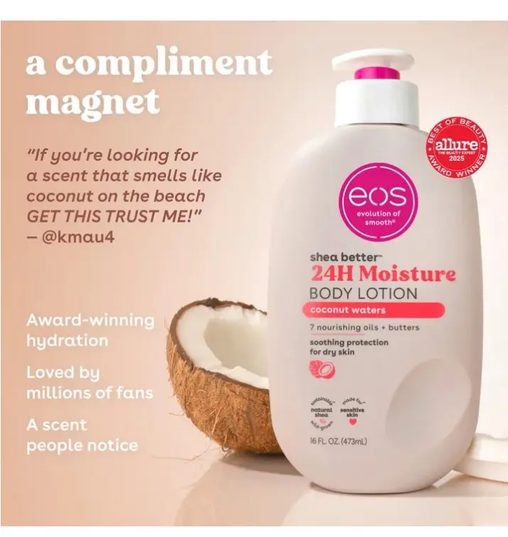 ·SHEA BETTER BODY LOTION: Our warm and sun-kissed Coconut Waters scent contains fragrance notes of creamy coconut, lush hibiscus, and solar musk. eos 24-hour hydration body lotion is made with natural ingredients to leave your skin smooth from head to toe.