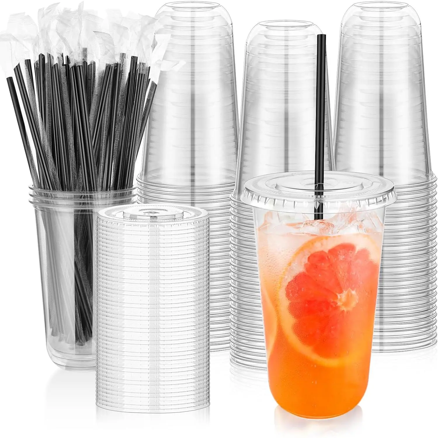 100 Set 16oz Plastic Cups with Lids and Straws, Disposable Black Clear Iced Coffee Cup with Lid, Round Bottom Plastic To Go Cups for Cold Drinks Slushie Smoothie Soda Bar Party Shop Supplies