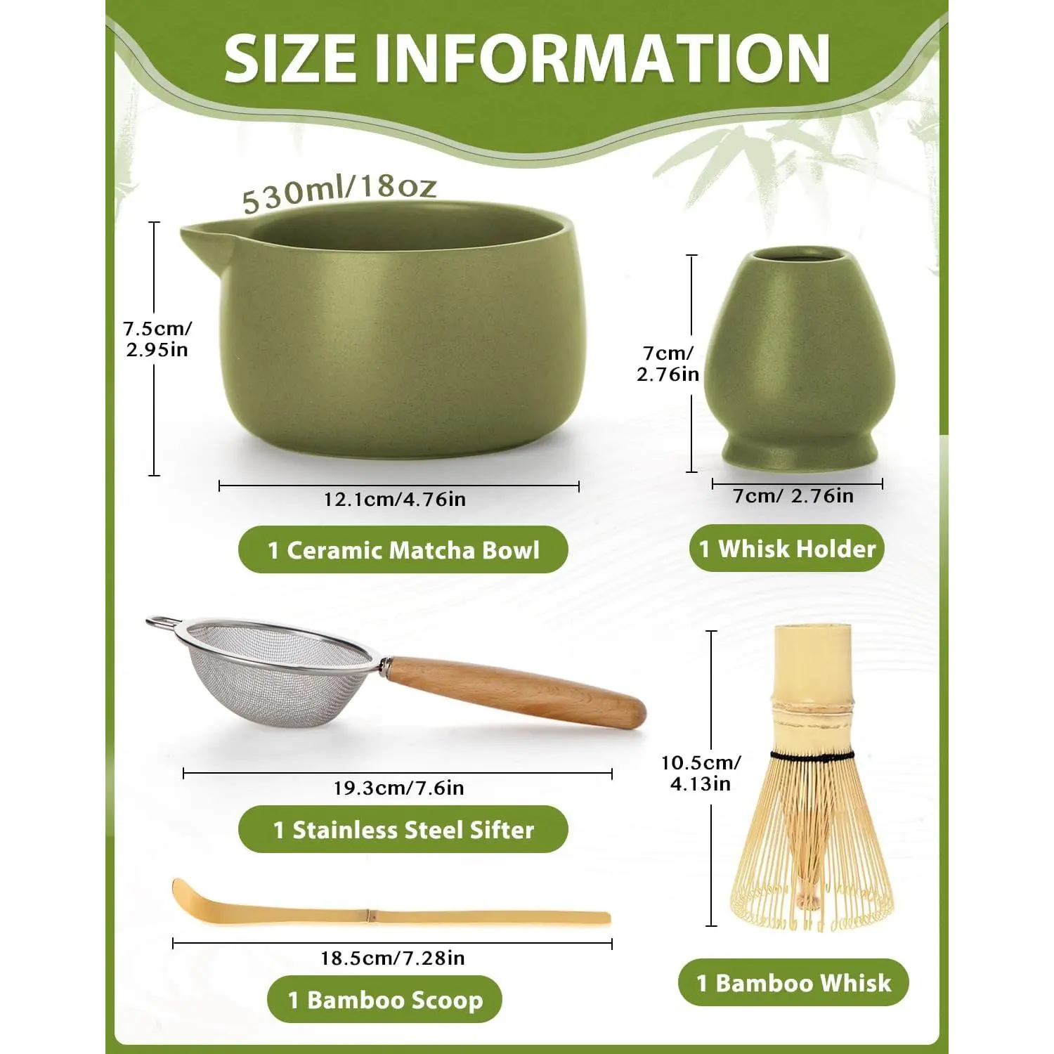 20OZ Matcha Whisk Set - 5PCS Japanese Tea Set Includes Matcha Bowl with Spout, Bamboo Whisk with Ceramic Holder, Bamboo Scoop and Sifter, Matcha Kit for Ceremony, Gift for Matcha Lovers (Matcha Green)