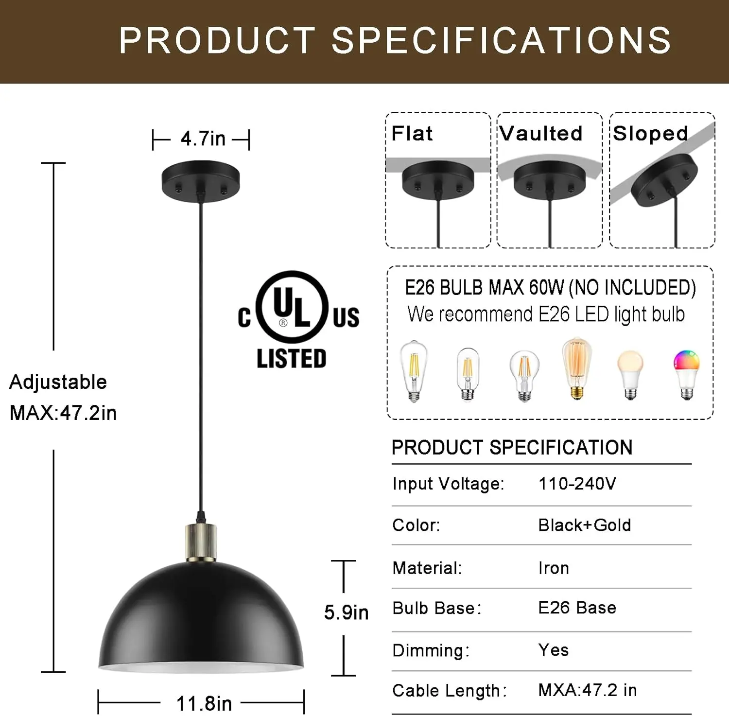 Black Pendant Lights Kitchen Island, 11.8" Modern Dome Farmhouse Hanging Lighting for Dining Room Hallway Entryway