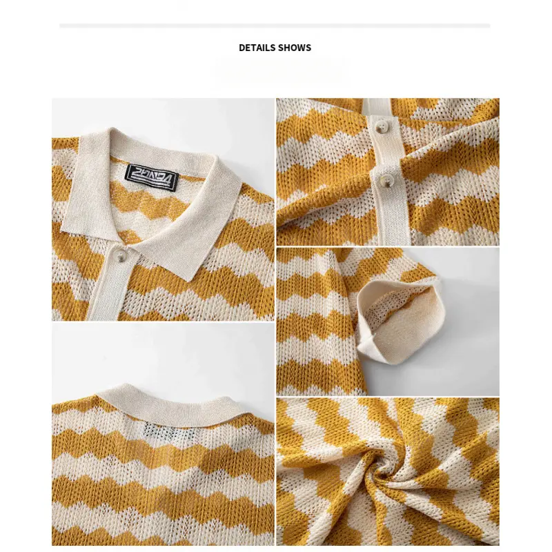 Men's Vintage Hong Kong Style Wave Pattern Hollow Knit Shirt with Turn-down Collar, Summer Short Sleeve Casual Polo Shirt