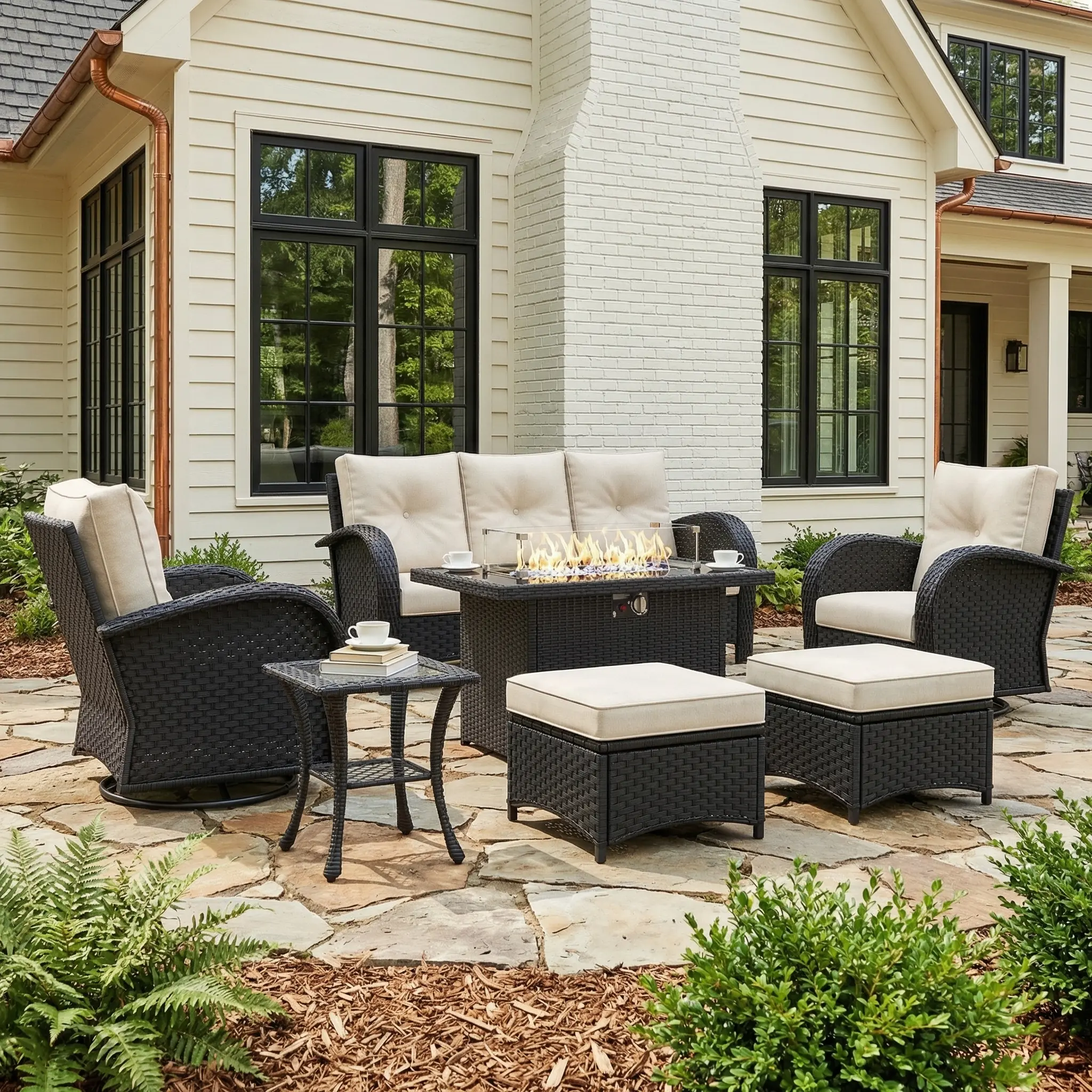 This LayinSun outdoor furniture set centers on warm woven textures and soft cushions, using a rich interplay of materials to create a relaxing atmosphere that offers both a sense of coziness and openness. Place it in a corner of your yard or on a terrace, where the dancing flames of the fire pit, the plush cushions, and the surrounding greenery and lighting complement each other, instantly transforming your outdoor space into a healing corner where you can unwind.
