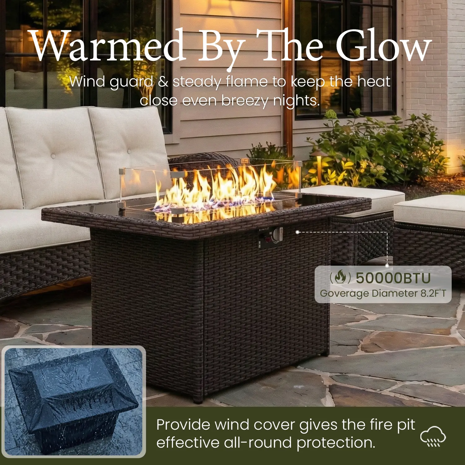 Flame to Table: 55000 BTU of warmth dispels the slight chill of the night. When flame goes out, simply cover it with the lid, and it transforms back into an elegant and composed coffee table, two functions to switch between at will.