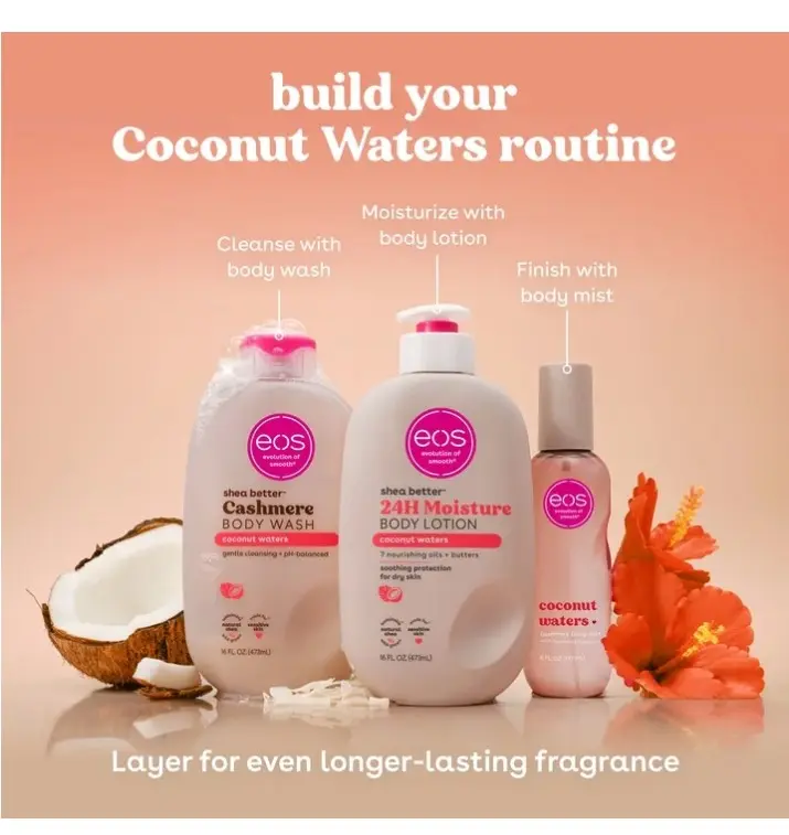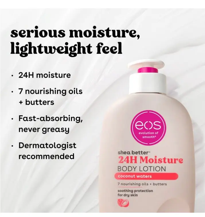 ·SHEA BETTER BODY LOTION: Our warm and sun-kissed Coconut Waters scent contains fragrance notes of creamy coconut, lush hibiscus, and solar musk. eos 24-hour hydration body lotion is made with natural ingredients to leave your skin smooth from head to toe.