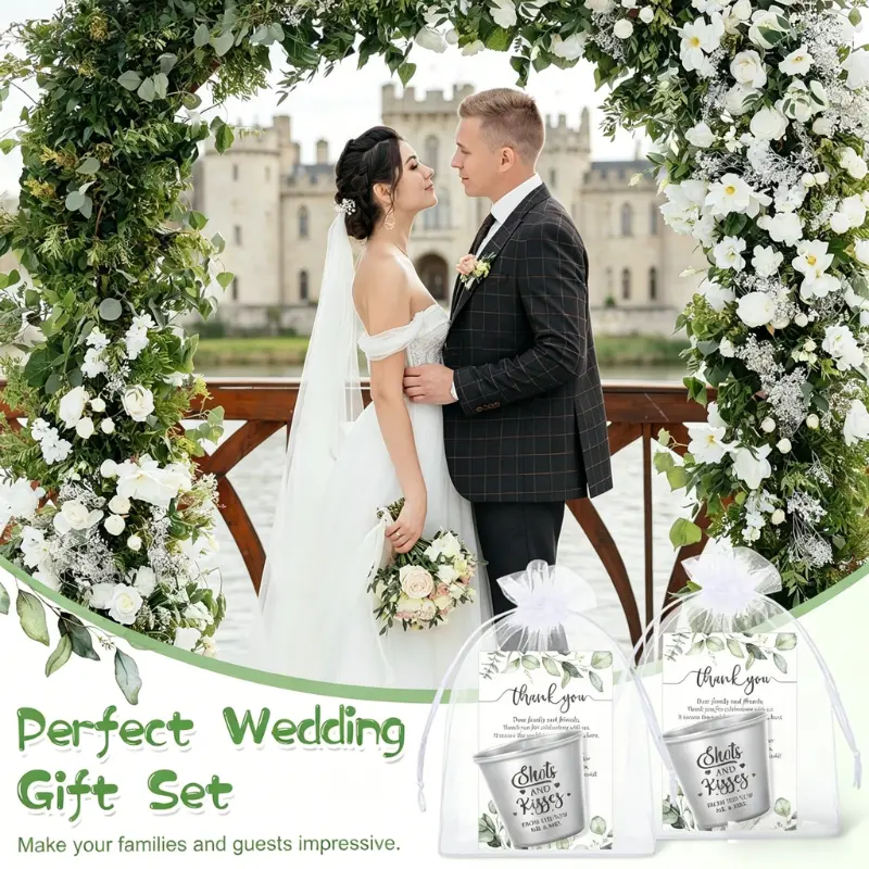 Each shot glass is printed with “Shots and Kisses from the new Mr & Mrs” for a sweet, memorable touch. Paired with simple, elegant cards and delicate organza bags, this set fits any wedding theme perfectly.