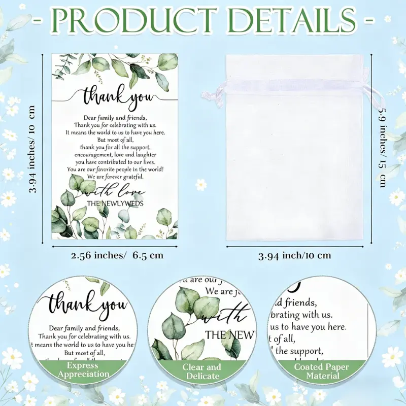 Our shot glasses are made of durable stainless steel for long-lasting use. The thank-you cards use sturdy 250g coated paper that resists tearing and creasing, while the organza gift bags offer an elegant, durable finish.