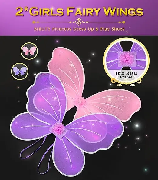 ·Dress Up Clothes for Little Girls 3-6: Every princess needs her wings. Imagine how could flower fairies dance without wings. Even the boys want their own wings. BIBUTY princess dress up clothes for little girls, a hit for imaginative play time with 2 sets of fairy wings for girls, princess shoes and girls tutu skirts, great variety in girl's options. Girls fairy costume in very nice giftable box, great as a gift toy for toddler little girls.