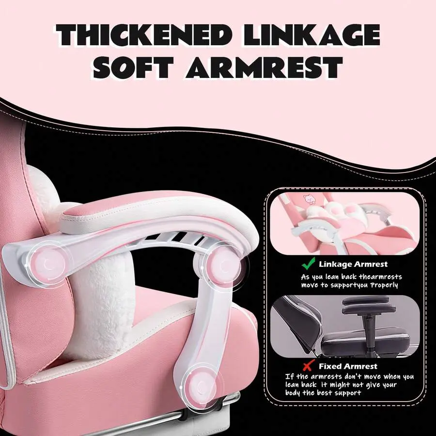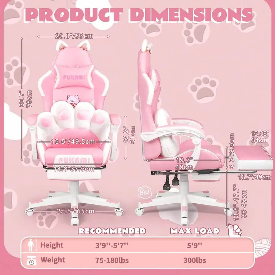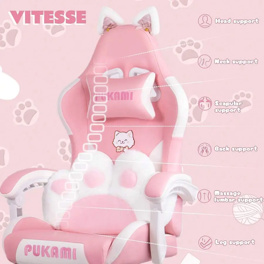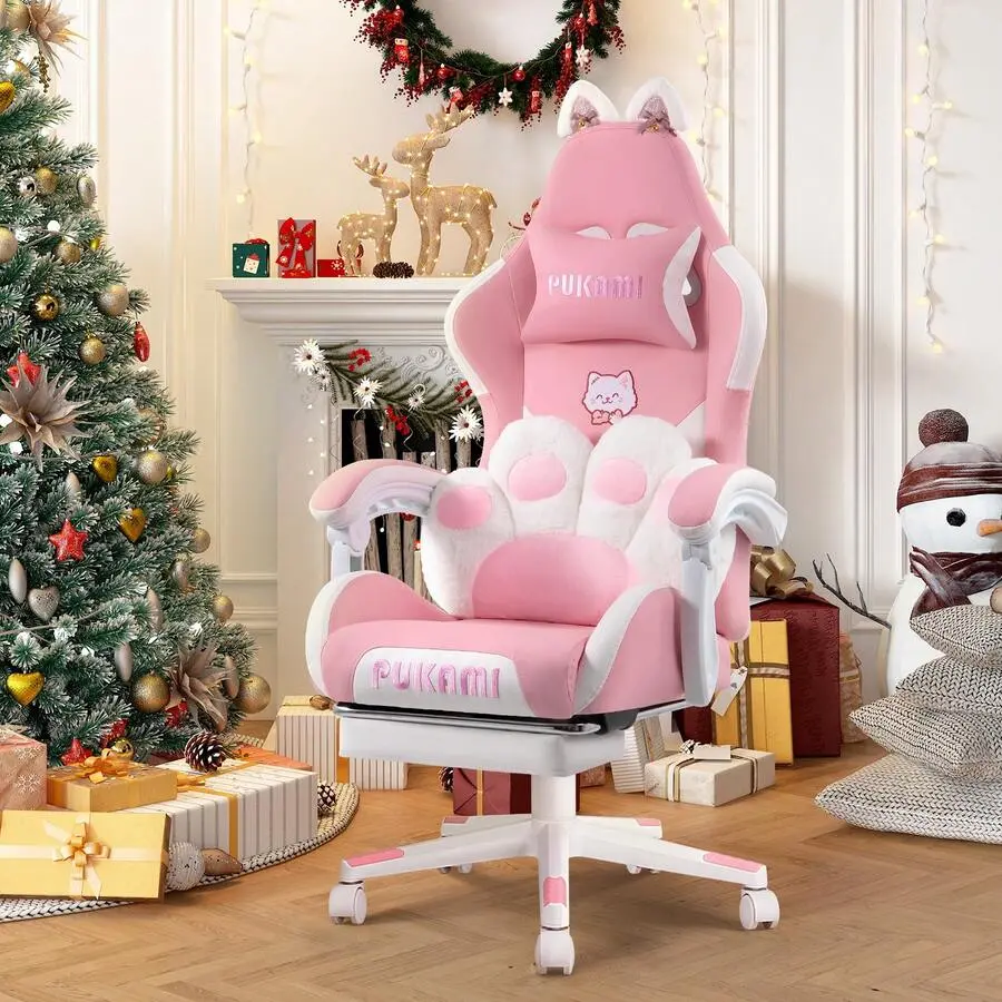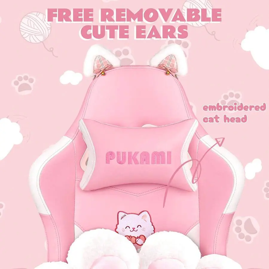 Designed with a playful yet practical aesthetic, this pink gaming chair features adorable cat ears on the headrest and a soft cat paw lumbar cushion, adding a fun, girl-friendly touch that stands out in any room.The ergonomic design is tailored to keep you comfortable during long sessions: the adjustable headrest supports your neck, while the cat paw lumbar cushion provides targeted support for your lower back, reducing fatigue even after hours of gaming or sitting.