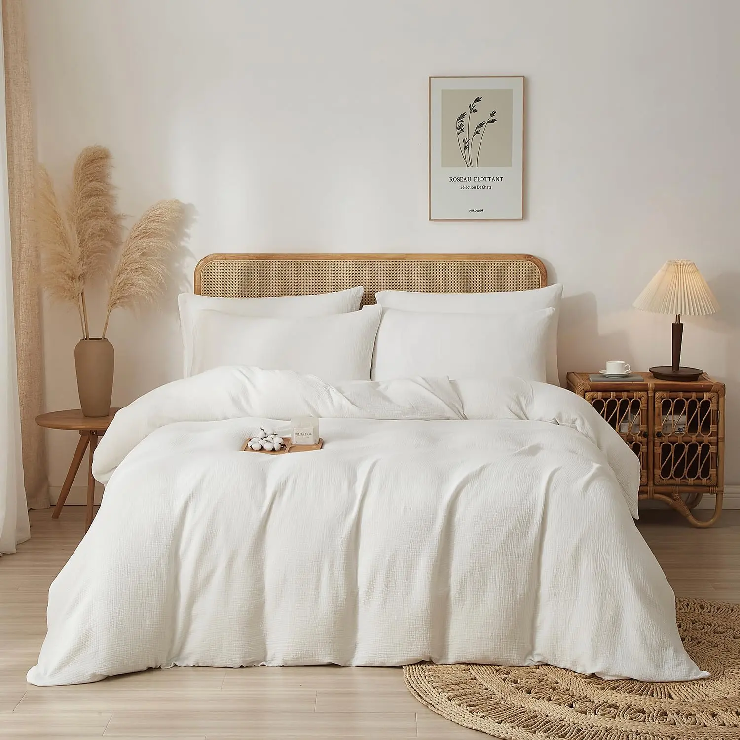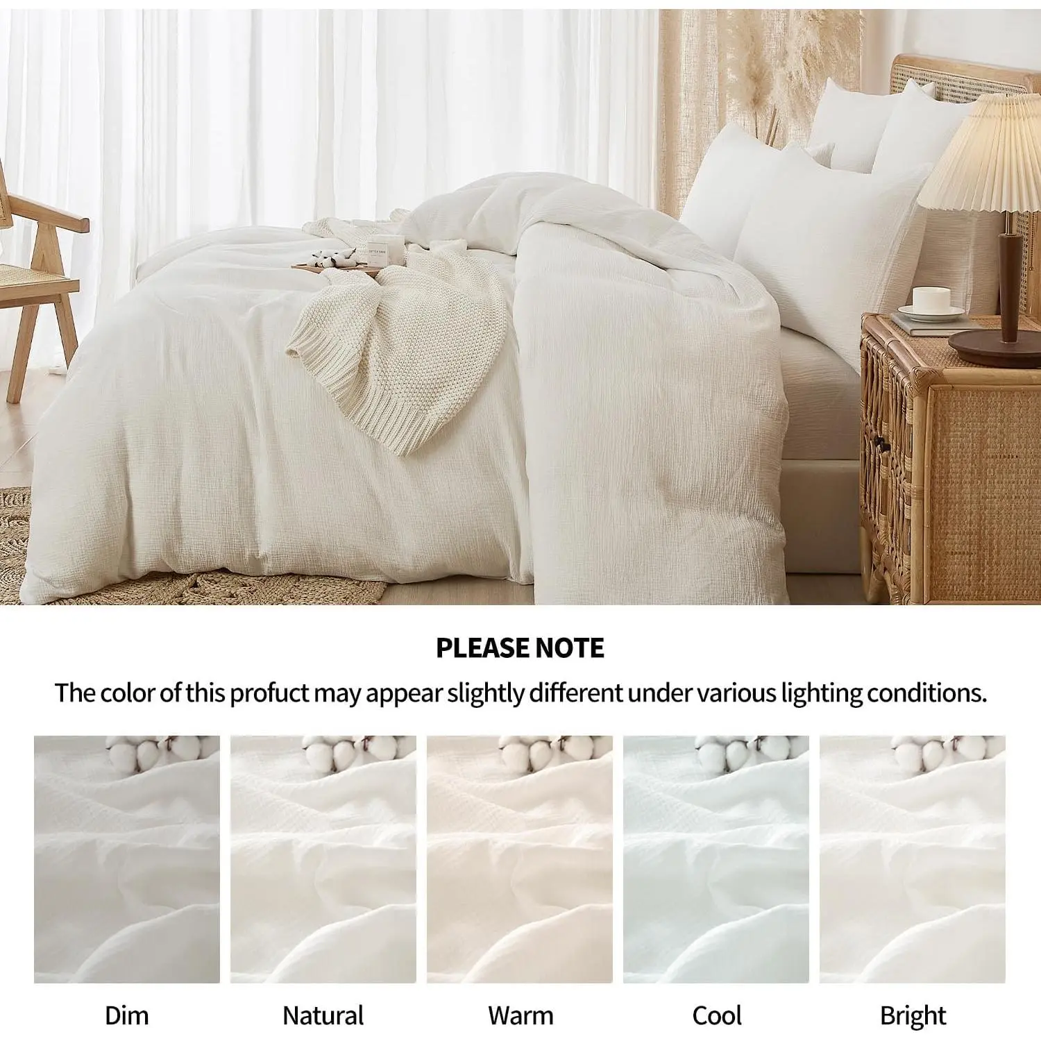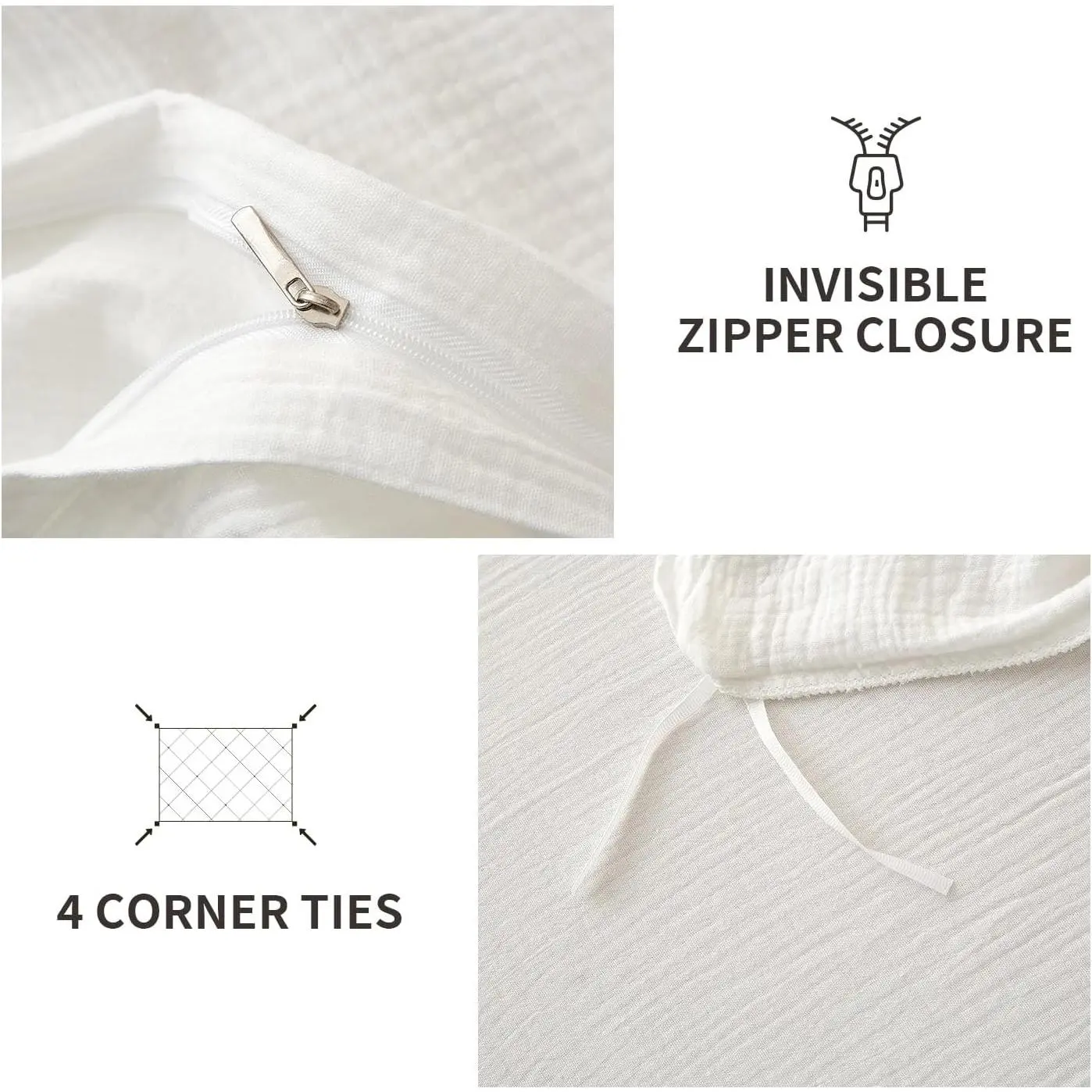 ✿✿Lightweight Airy Duvet Cover Set: YASMENG Muslin duvet cover set white is made of 100% cotton gauze fabric with a double-layer yarn textile process, breathable, fluffy and lightweight, Which preventing skin irritation for your sensitive skin and providing you a luxurious comfy feel, also perfect for co-sleeping with baby.Heat conduction and moisture-absorption properties allow our comforter cover set to be used all year round, cool in summer for hot sleepers, and warm in winter.✿✿Chic Crinkle Design: The fluffy structure of muslin material with unique 2-layered weave provides exceptional breathability and soft hand feel.This cotton gauze duvet cover set pure white has wrinkled texture and linen-like feel to adds a touch of sophistication to your bedding.The naturally relaxed texture introduces a laid-back elegance that complements any interior decor with its chic crinkle and solid color design.✿✿Gift Ideas: the monochrome effects of muslin cotton bedding queen can be easily blended with any furniture and will make the room look delicate and timeless.Ideal for any bedroom, including guest rooms and vacation homes.Perfect for gifting on special occasions like Thanksgiving, Christmas, Valentine's Day, Mother's Day, and more.For year-round softness and prevention of pilling, wash in gentle cycles with cold water.✿✿Zipper Closure & Corner Ties: This full/queen size muslin duvet cover set ensures it meets the highest standards for safety, free from harmful chemicals, and safe for human use.Our sand cotton gauze duvet cover uses a delicately hidden zipper, easy to put the quilt insert in or outStrong corner ties are distributed in 4 corners of the duvet cover to secure your comforter in place firmly.while the envelope-style pillowcase design ensures easy access to your pillows.✿✿Package & Care: This queen size set includes 1 duvet cover (90" x 90") and 2 envelope pillowcases (20" x 26").Note: No comforter insert is included.Machine or hand wash Cold, gentle cycle, Wash separately, don't bleach, and Tumble dry low.The slightly wrinkled look material ensures a relaxed and textured farmhouse style and doesn't need to be ironed.