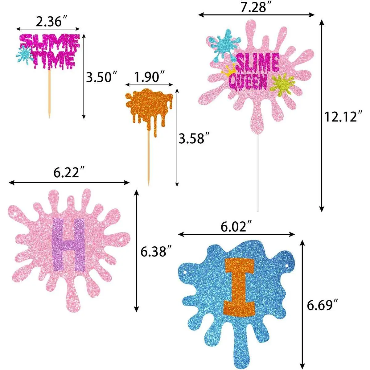 ćSafe materialć Both the slime banner and cupcake toppers are made of glitter cards which are non-toxic and safe to foods, thick, durable and sturdy to use, can serve you for a long time