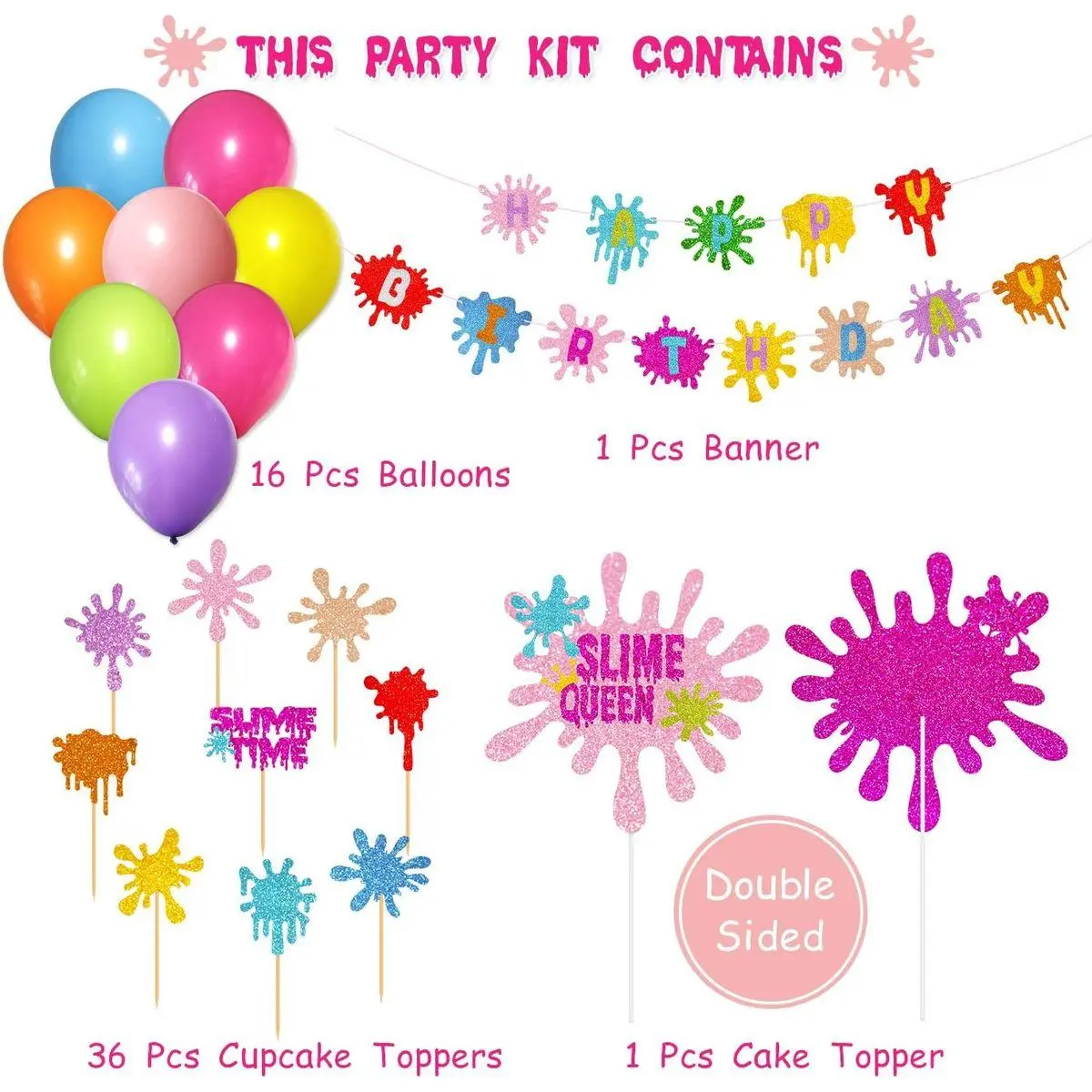 ćWhat will you getć - 1x slime happy birthday banner; 1 x slime queen cake topper; 36pcs x slime cupcake toppers; 16pcs balloons(2 x purple balloons, 2 x yellow balloons, 4 x rose red balloons, 2 x light green balloons, 2 x sky blue balloons, 2 x orange balloons, 2 x pink balloons). All the decorations are designed to perfectly matches slime theme party.
