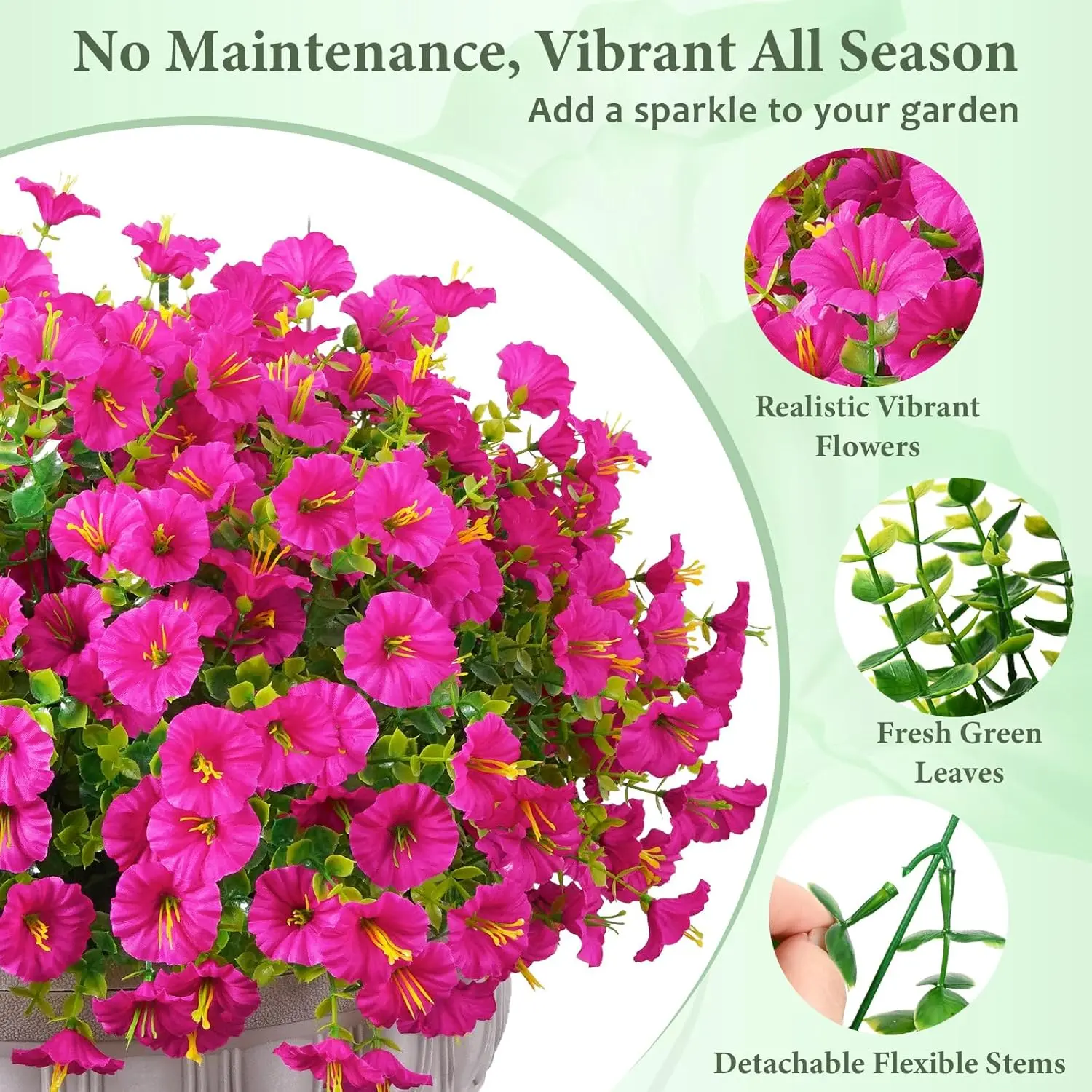 Add vibrant, natural charm to your home and garden with our realistic artificial petunia bundles.No watering, no fading, no wilting-enjoy fresh, lively beauty all year long.