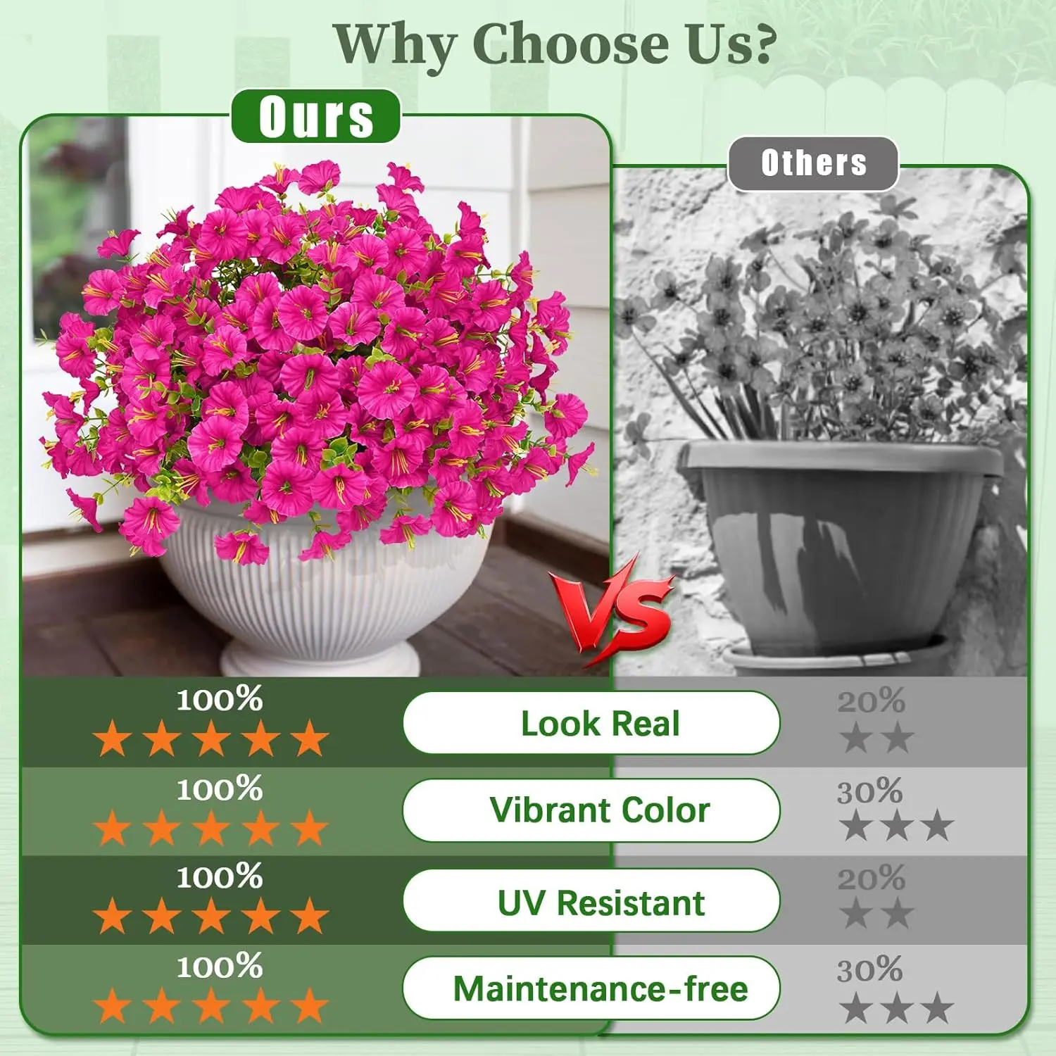 Our outdoor artificial flowers are made with premium materials and fine craftsmanship, blending petunia blooms with eucalyptus leaves for a vivid, lifelike texture and authentic appearance.The full, lush design looks just like real fresh flowers, ideal for upgrading any space with effortless beauty.