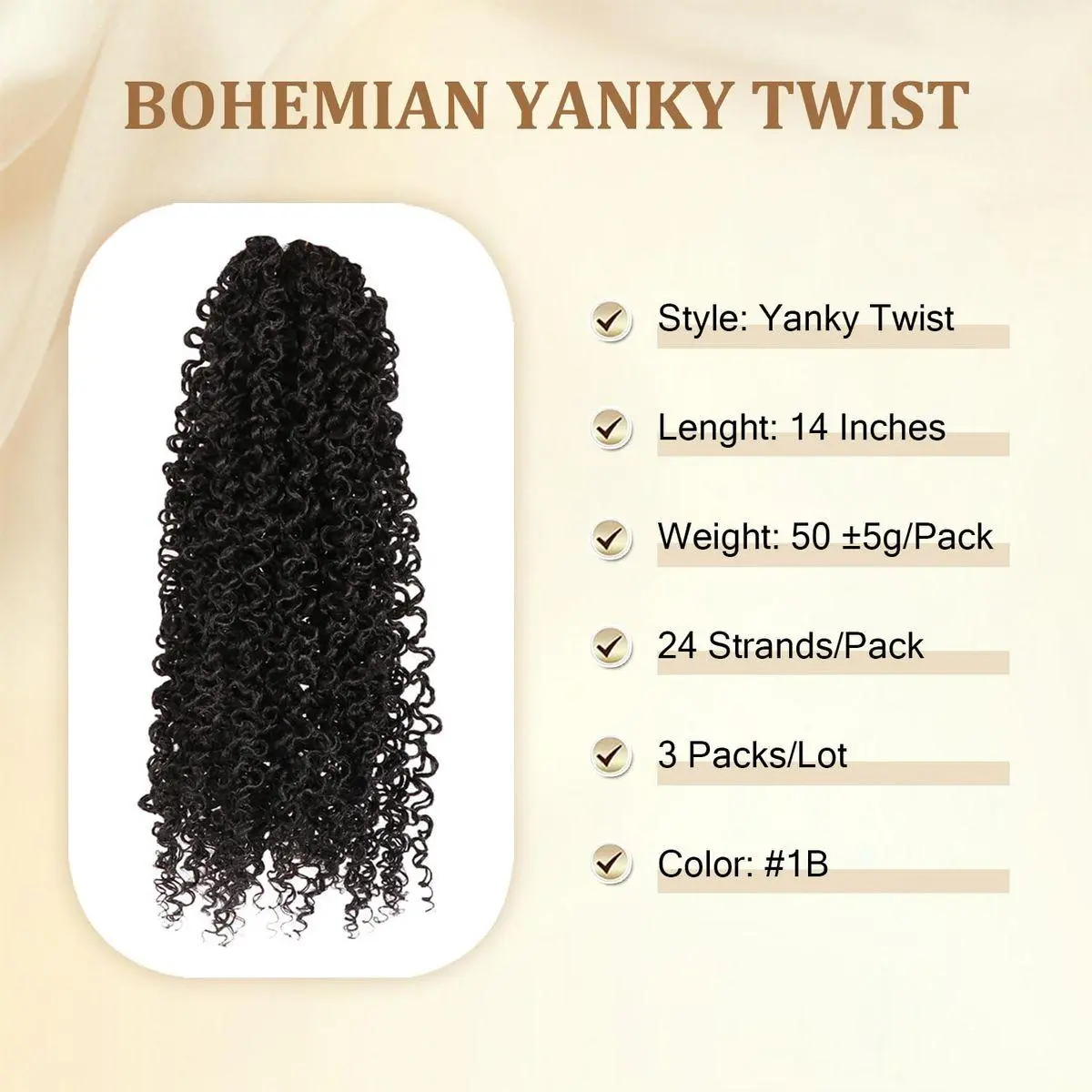 【Pre-twisted Yanky Twist Crochet Hair】Get ready to show off your charm with our beautiful Yanky Twists Braiding Hair Curly Ends! Our new style Bohemian Yanky Twists Crochet Braids is Pre-Twisted, with very natural little curls at the ends, very cute. 3 packs/lot, 24 strands/pack, total 168 strands,usually 3 packs can full one head.There are many colors to choose from to match your style!