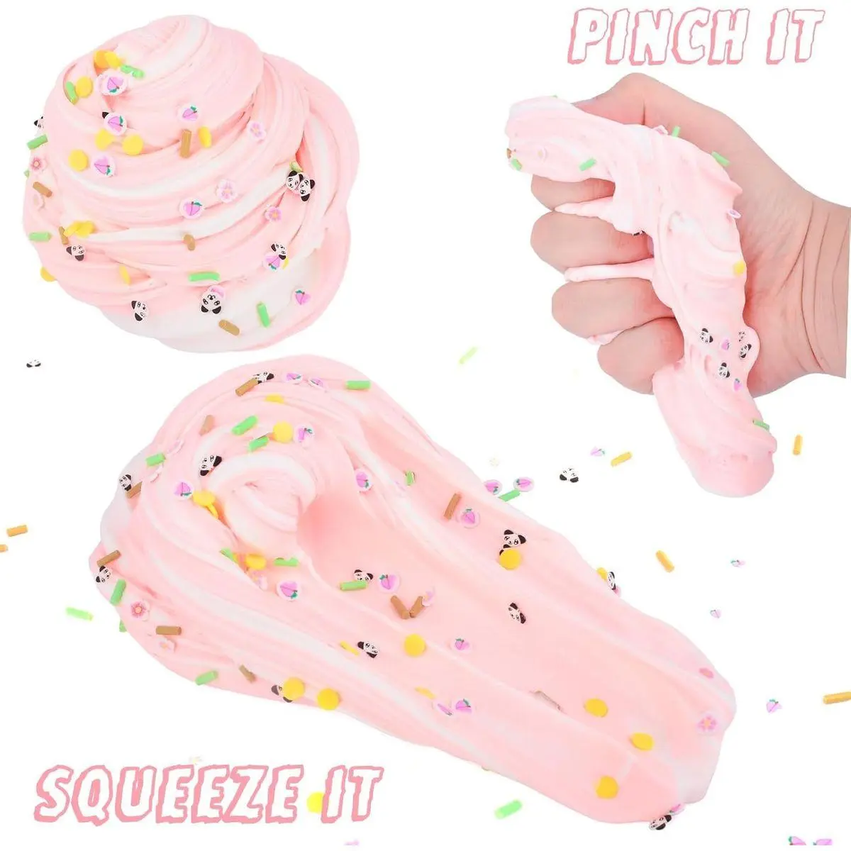 Panda Slime Bucket Set: Kids' favourite two-colour butter slime, a 300ml bucket of butter slime (Peach + White) with 5 Panda charms, 1 sheet of cute stickers and 1 package of mixed peach and panda slime resin flakes