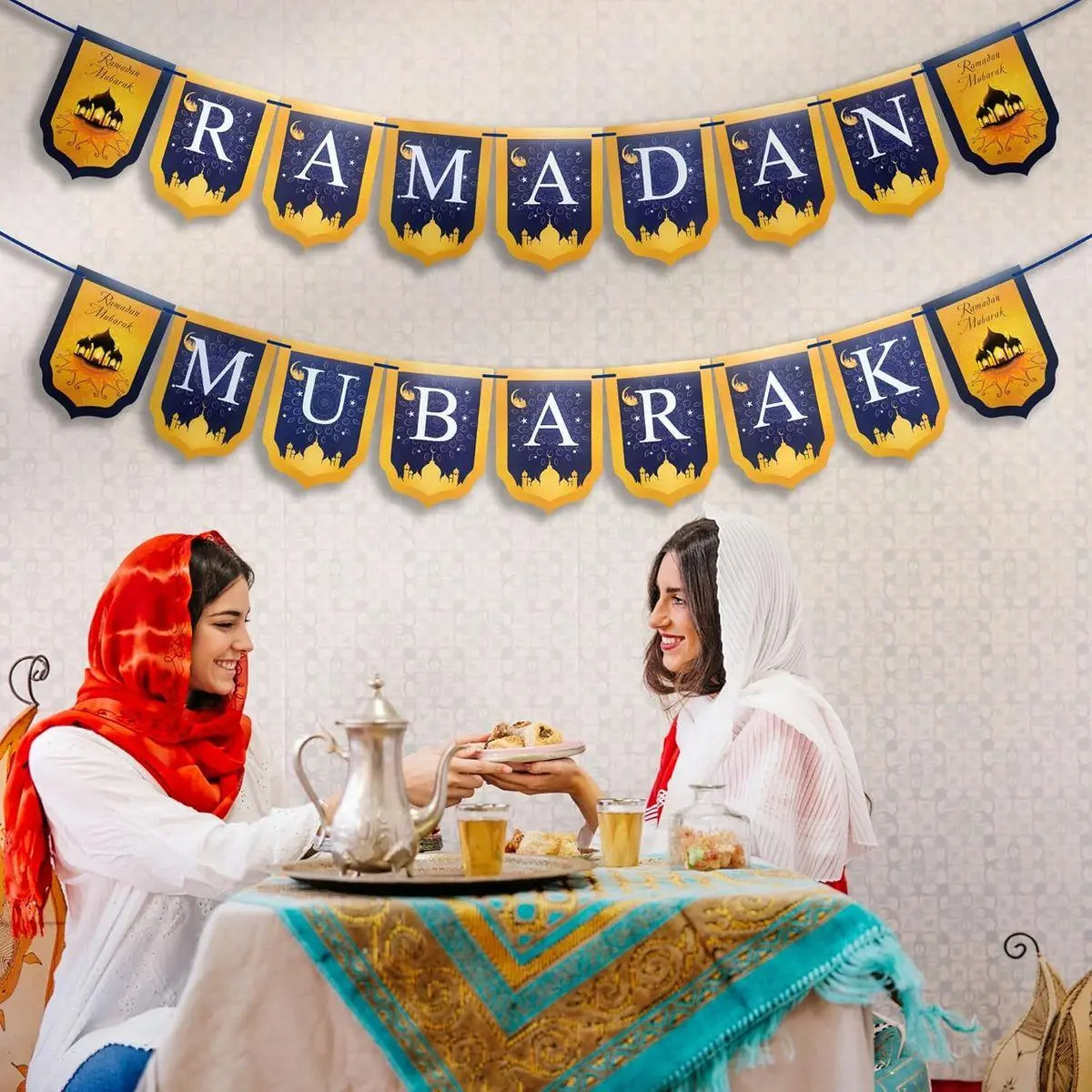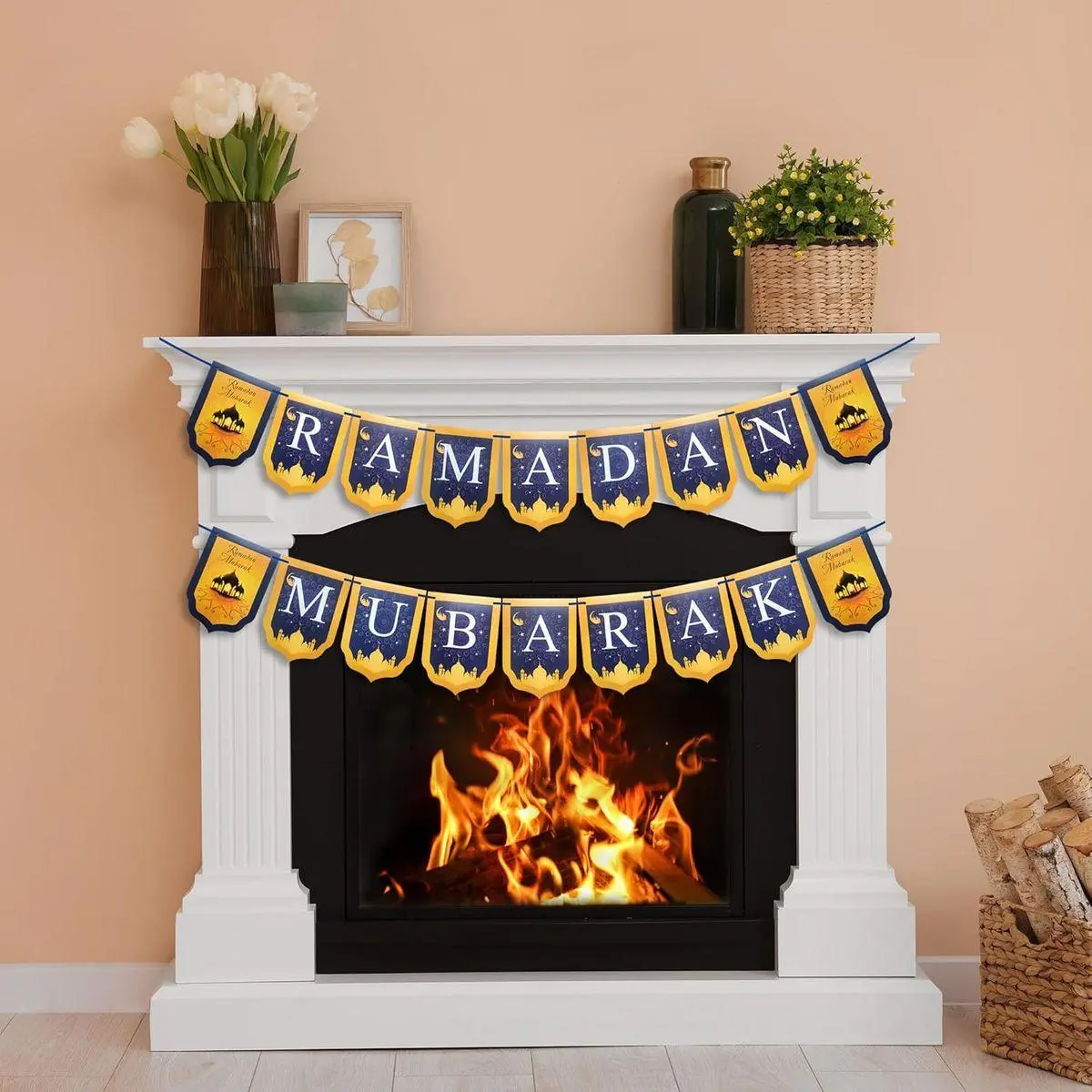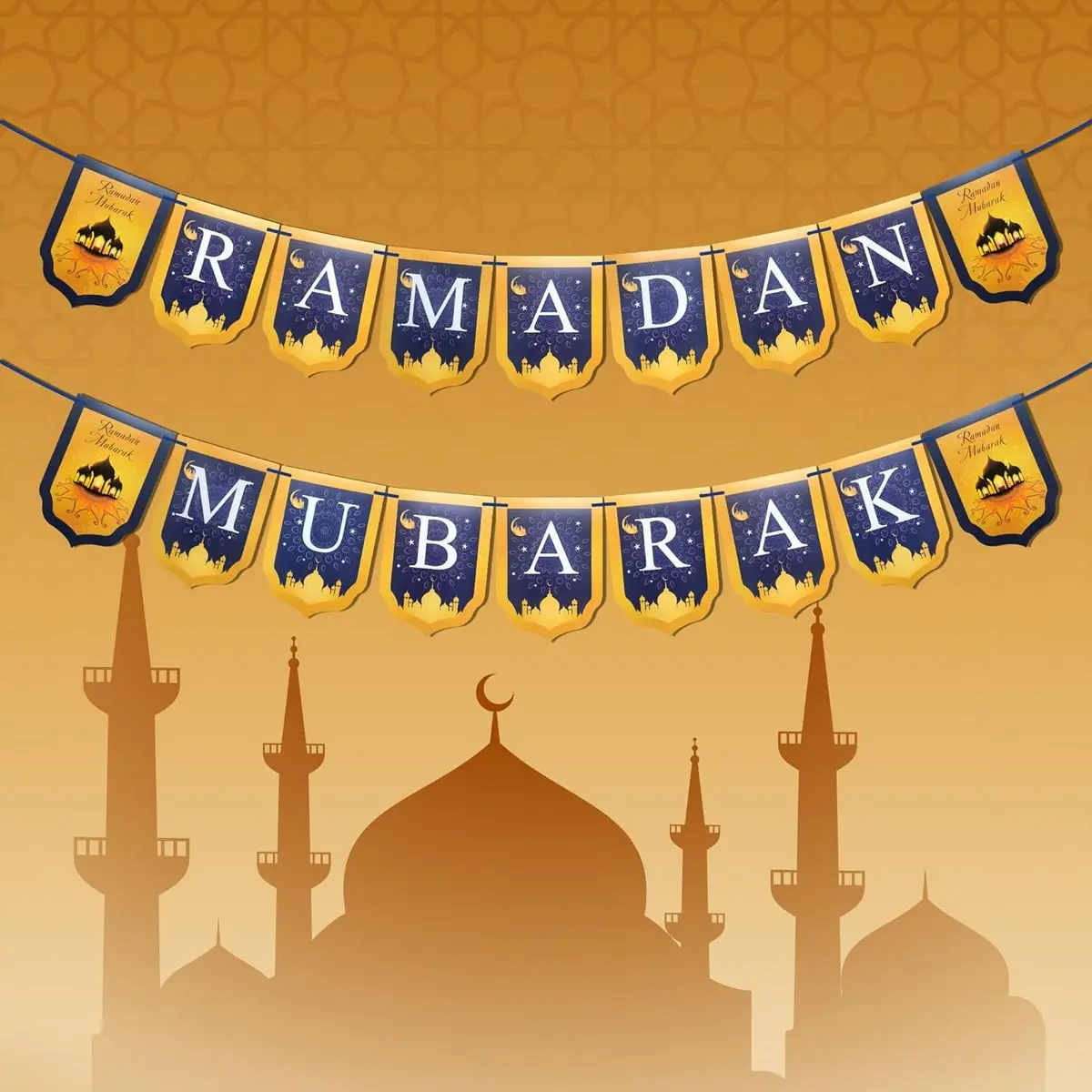 5. Ramadan Mubarak Banner, Ramadan Banner, Muslim Islamic Gift for Ramadan and EID Celebration, Festival Hanging Decorations for Home, Mantle, Fireplace, Wall, Party Supplies (Gold and Blue)